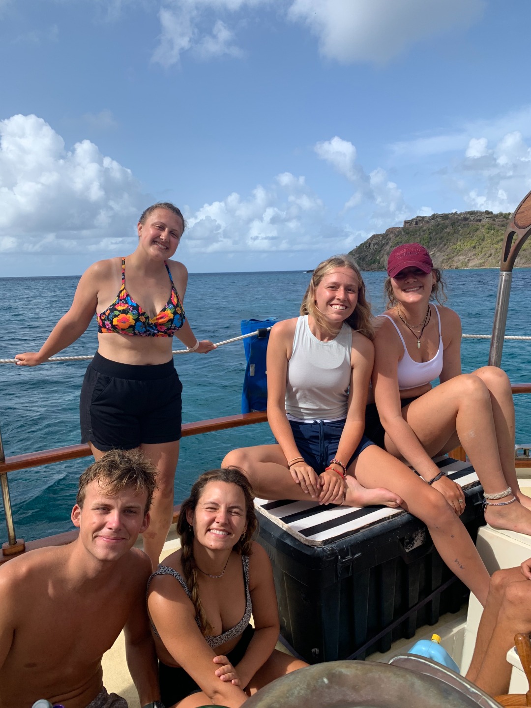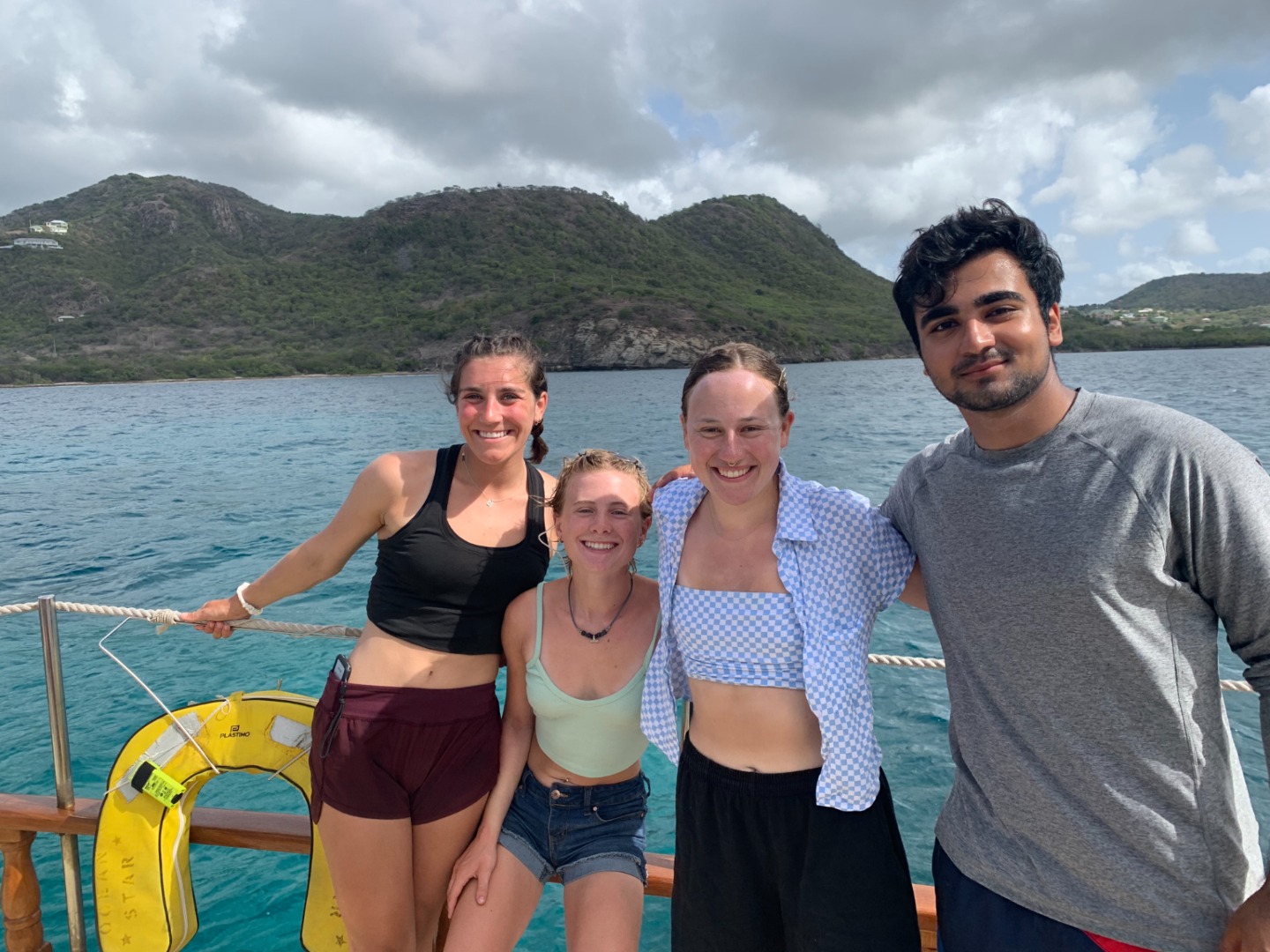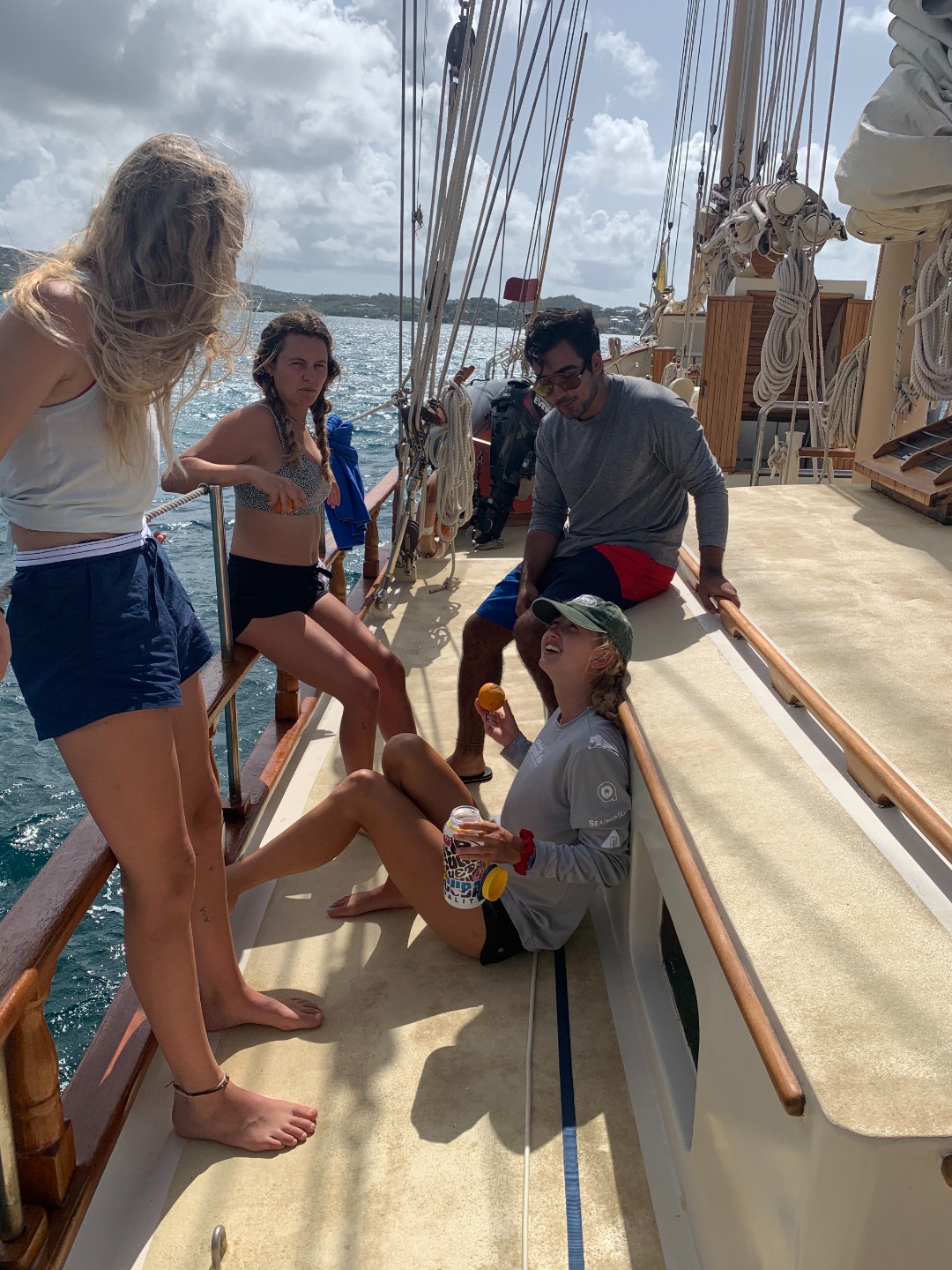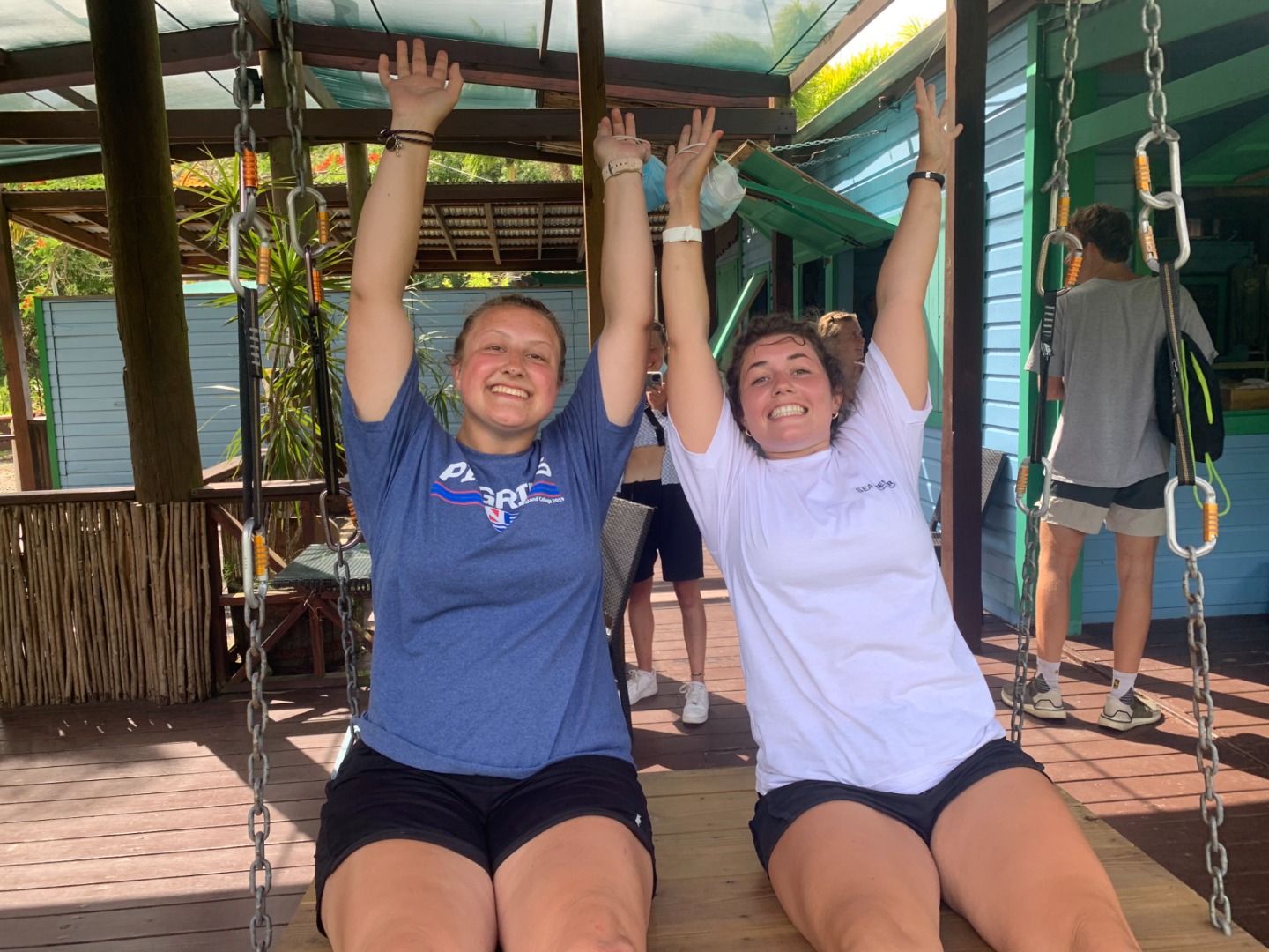 After going through each scenario, everyone finally got to shore to check out the local coffee shops before our taxi pick-up to the zip-line and high ropes course. When we arrived, we were greeted by the friendly dog, Cashew, who only wanted scraps of food from our packed lunches. Cashew reminded me of my own dog, Monroe, who has become quite famous on board for the numerous times that I mention her or try to show someone a photo of her. (Don’t worry, I included a photo of her begging for tummy rubs while holding a stuffed shark toy). Once we finished lunch, we all got geared up with a harness, helmet, and gloves. We looked quite professional with all our gear on. We then zoomed through the zip-lines and even got some killer photos of Maddie and Ellery in action. The high ropes course proved to be a bit more of a challenge, especially when Kelsey was shaking the wire I was trying to walk across. After struggling through the course, we finally all made it to the end, where we chilled on a swinging platform or took the opportunity to grab some sweet selfies.