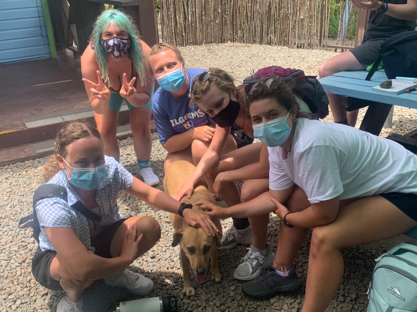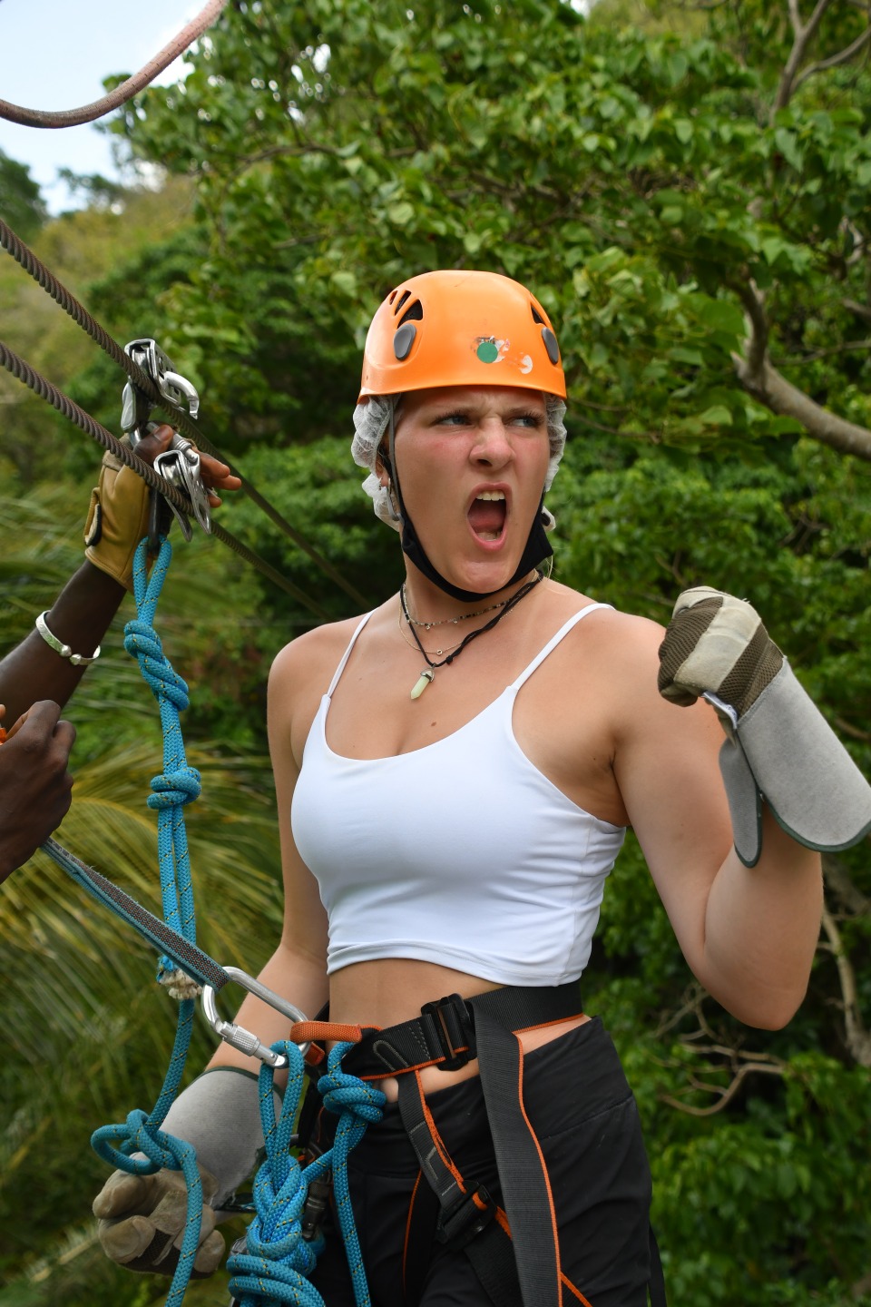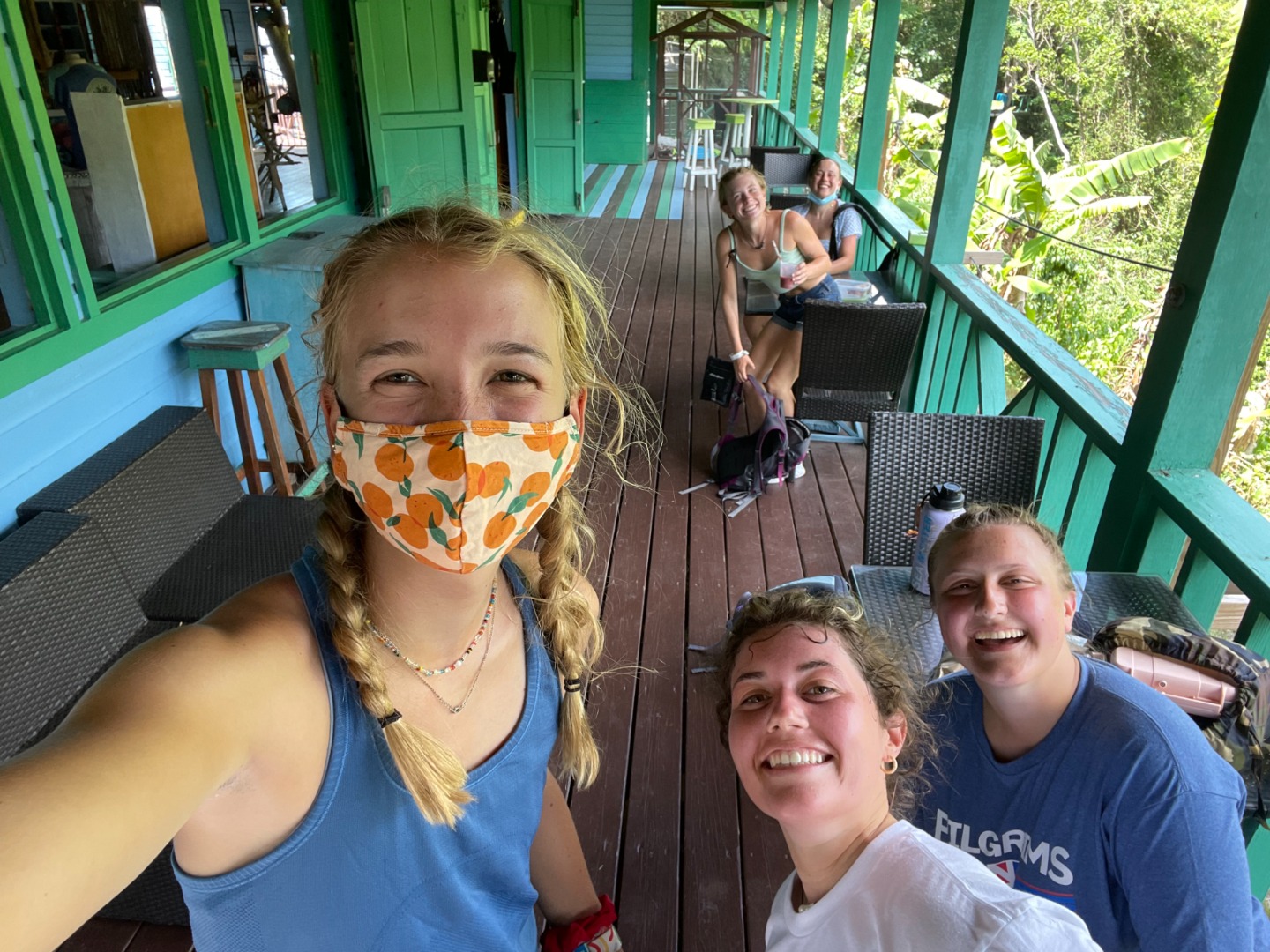 After going through each scenario, everyone finally got to shore to check out the local coffee shops before our taxi pick-up to the zip-line and high ropes course. When we arrived, we were greeted by the friendly dog, Cashew, who only wanted scraps of food from our packed lunches. Cashew reminded me of my own dog, Monroe, who has become quite famous on board for the numerous times that I mention her or try to show someone a photo of her. (Don’t worry, I included a photo of her begging for tummy rubs while holding a stuffed shark toy). Once we finished lunch, we all got geared up with a harness, helmet, and gloves. We looked quite professional with all our gear on. We then zoomed through the zip-lines and even got some killer photos of Maddie and Ellery in action. The high ropes course proved to be a bit more of a challenge, especially when Kelsey was shaking the wire I was trying to walk across. After struggling through the course, we finally all made it to the end, where we chilled on a swinging platform or took the opportunity to grab some sweet selfies.