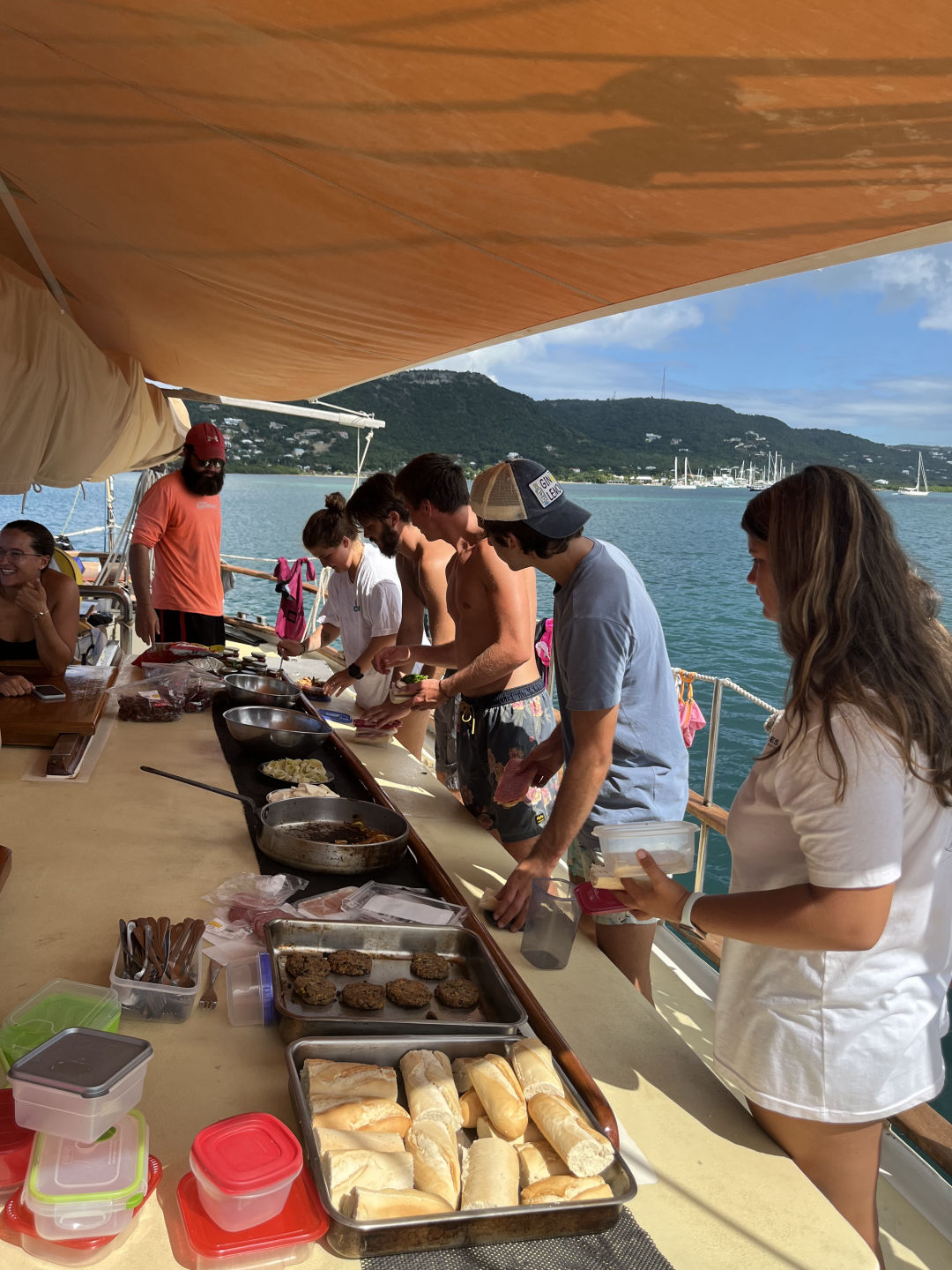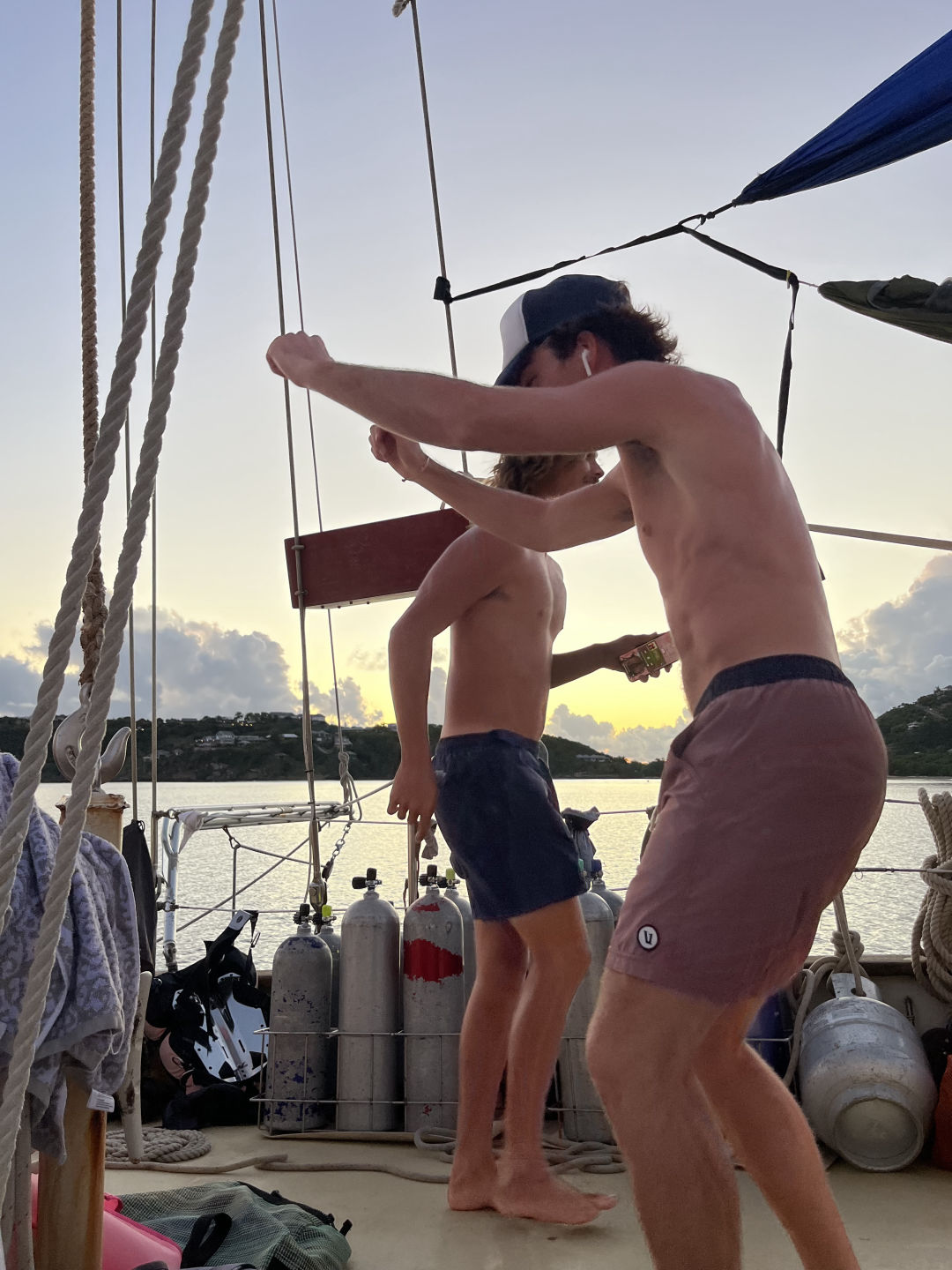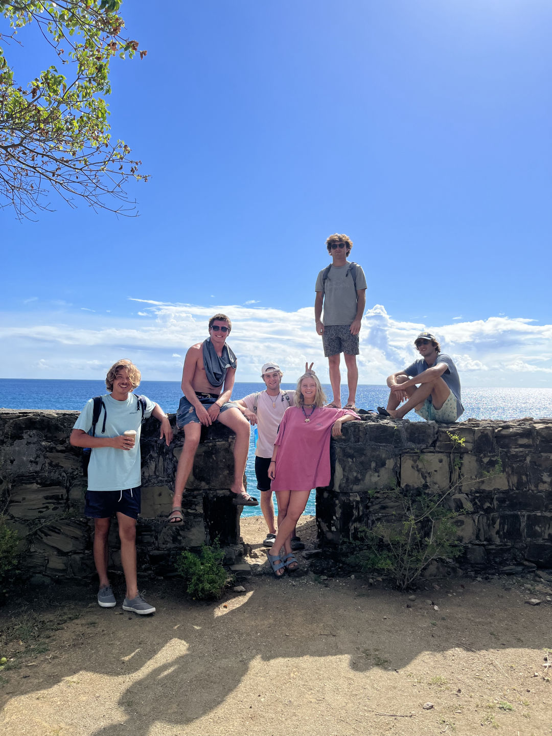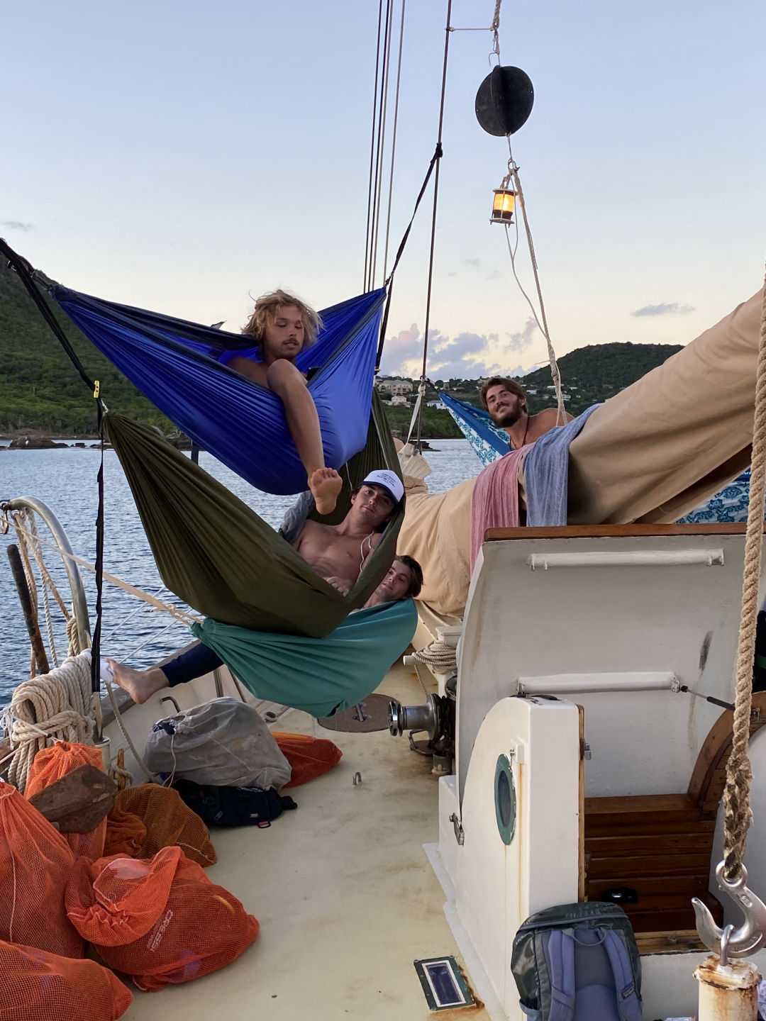 ‘Ellooooo to all the loved ones out there! Let me begin by painting the present picture for you here on O Star. As I write the blog and the rest of the crew finish up their duties of the day, we are all trying to keep a level head while a ba-gillian bugs swarm around and flip-flop on deck (I have been watching this one particular bug go around in a figure eight for the last 10 minutes…) what a scene. Anywho, today was a lovely day filled with adventures, per usual. We began with some delicious lemon poppy seed muffins courtesy of our head chef Dani–breakfast was a sellout! After our tummies were full and clean-up jobs were completed, we had our last Leadership class of the trip, where we watched Master and Commander of the HMS Surprise; it was quite an action-packed film. After our cinematic experience down in the Saloon, we made our way to shore. We wandered around Nelson’s dockyard and grabbed some refreshing drinks and snacks to cool down. We then began our beach day adventure, starting with a detour to a fort where we hopped along the rock wall and leaped across cannon cut-outs. The beloved soccer ball was almost lost FOR-E-VER, but thankfully the thorn bush saved it from its impending death down the cliff side. We scampered our way up the goat trail until we finally reached the lovely sandy beach at the end; there were some minor scrapes and thorns in the feet, but no major accidents went down (disregarding KT’s slip-up on the flat surface..). What a delightful 30-45min treat the beach-ie beach was; ‘da bois’ were throwing the football around playing jackpot while others swam some laps, played in the wata, and ate some pre-packed sandwiches–with some extra sand added. We then walked across a sketchy broken dock and hopped in Exy to bring us back aboard O.Star. We showered off the sand and got ready for some “damn good” fried rice from the head chef herself and sous Mia and Ashlyn–it was a crowd favorite for sure. After an efficient clean-up, half the crew went night diving, this being our last dive of the program:( The squad in the second dingy ride over had to give Exy some words of encouragement when she spat out on us right as we began our motor over to the site. Our coaxing did the job, and we were on our merry way to explore the shallow dark depths of the reef. We had a laughing party on the surface before the dive as we watched Alexis tow Exy and Nick back to the line and try to tie a bowline–a knot he still has yet to learn, although it is day 76–after he let them float away…The moonlight was so bright during the dive that when the time came to cover our lights up, we could still see ripples and reflections (with a sprinkle of bioluminescence) in the water, thanks to the lovely lookin’ moon. While this crazy adventure was taking place, the other half had a more relaxed evening and watched a motivational yet heart-wrenching film called Racing Extinction (greatly recommend for a tear jolt and wake-up call). The day ended with some chocolate munchin’ and a restful night’s sleep. A day well spent, one might say.