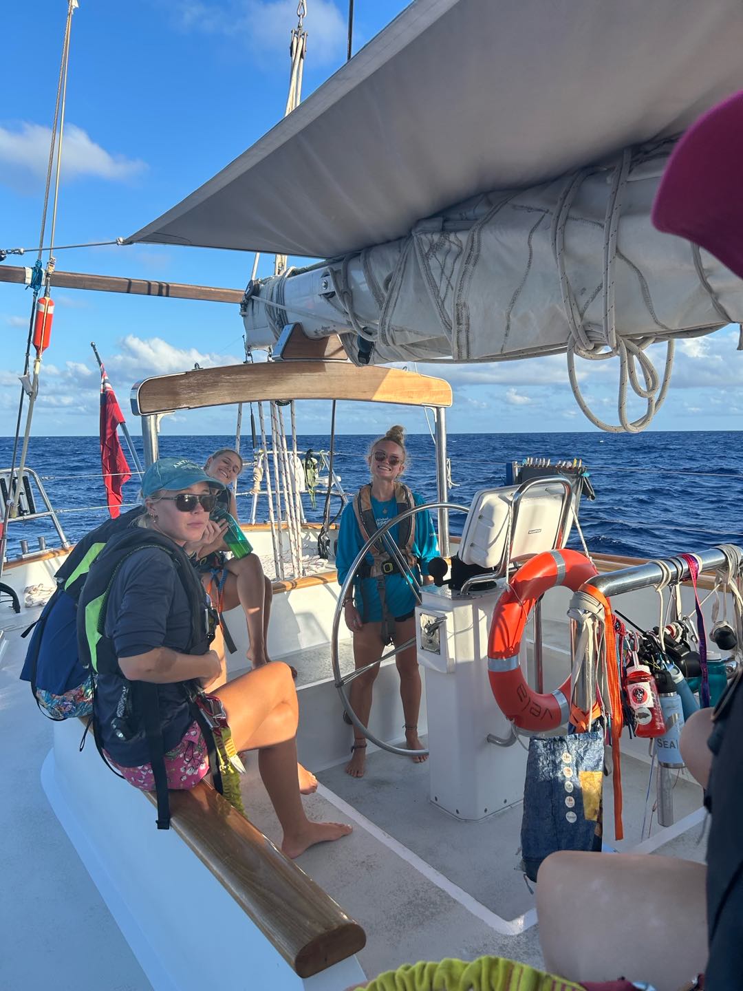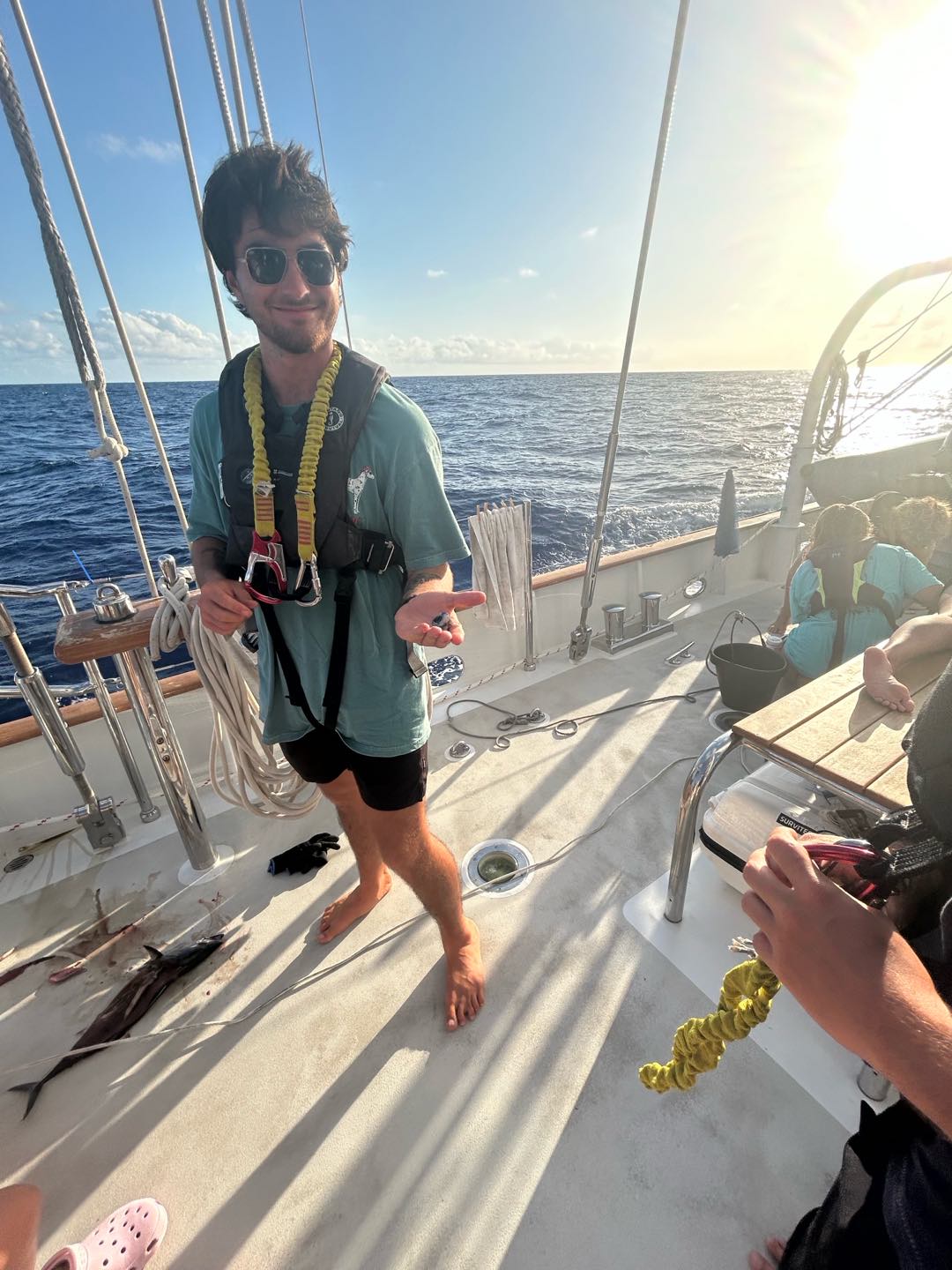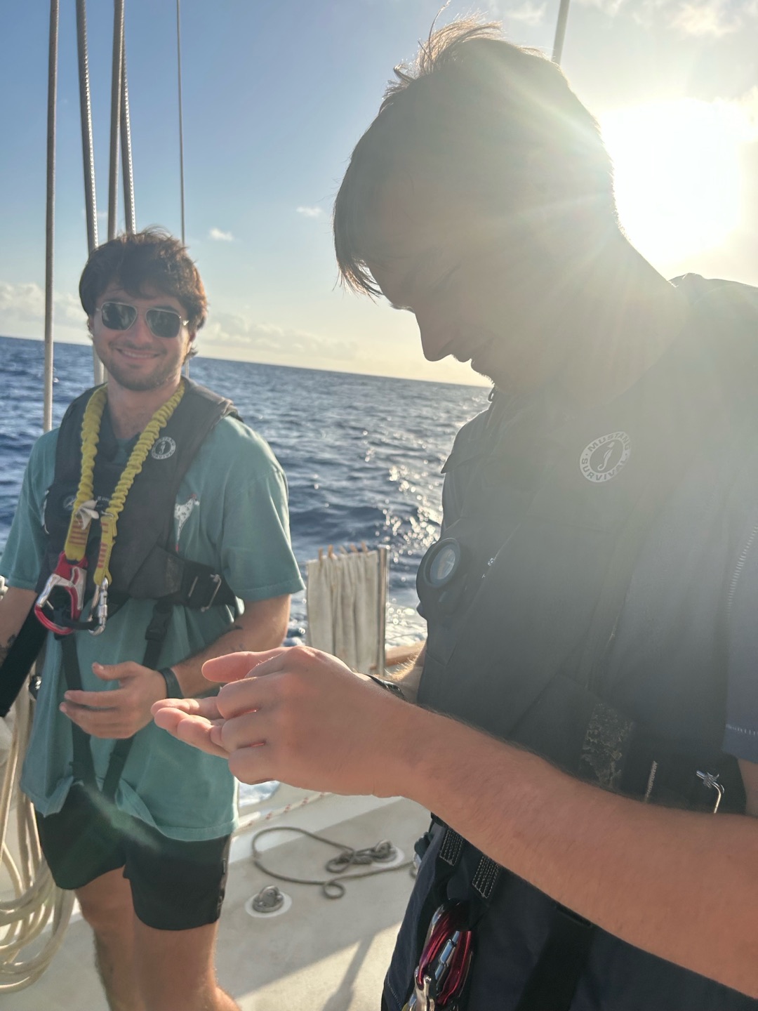 Gooddd morninggg, watch team three(Emma, Perry, Henry, Camilla, and I) and Grant had an early start today with some sail handling. Taking down the mainsail was really fun with just our headlights at four this morning, we did a great job though! Watch team two(Zoe, Kyler, Vittoria, Reed, and Alexa) had an extended watch to help us, which was much appreciated. They also had some stories to tell about taking down the flying jib.