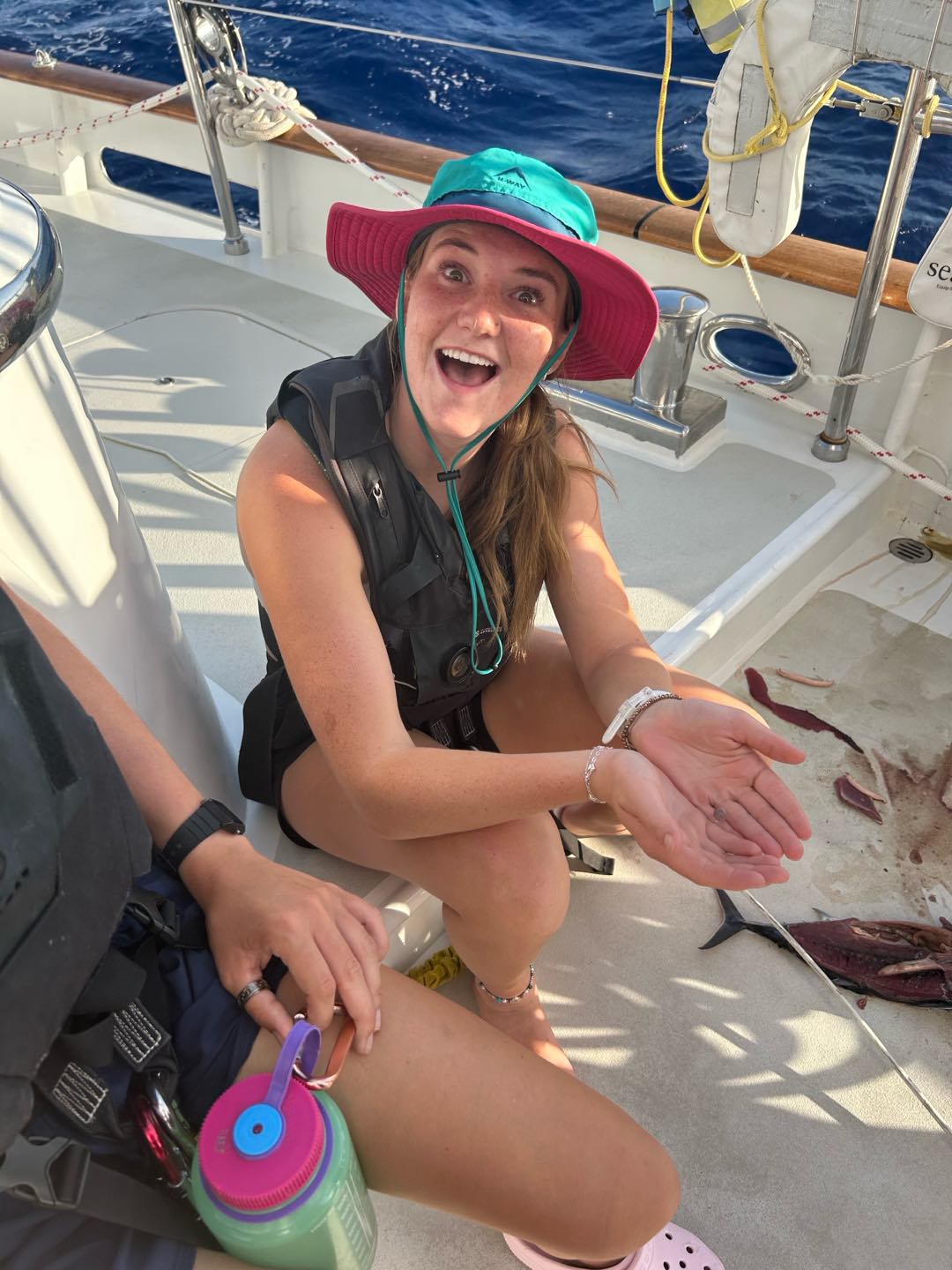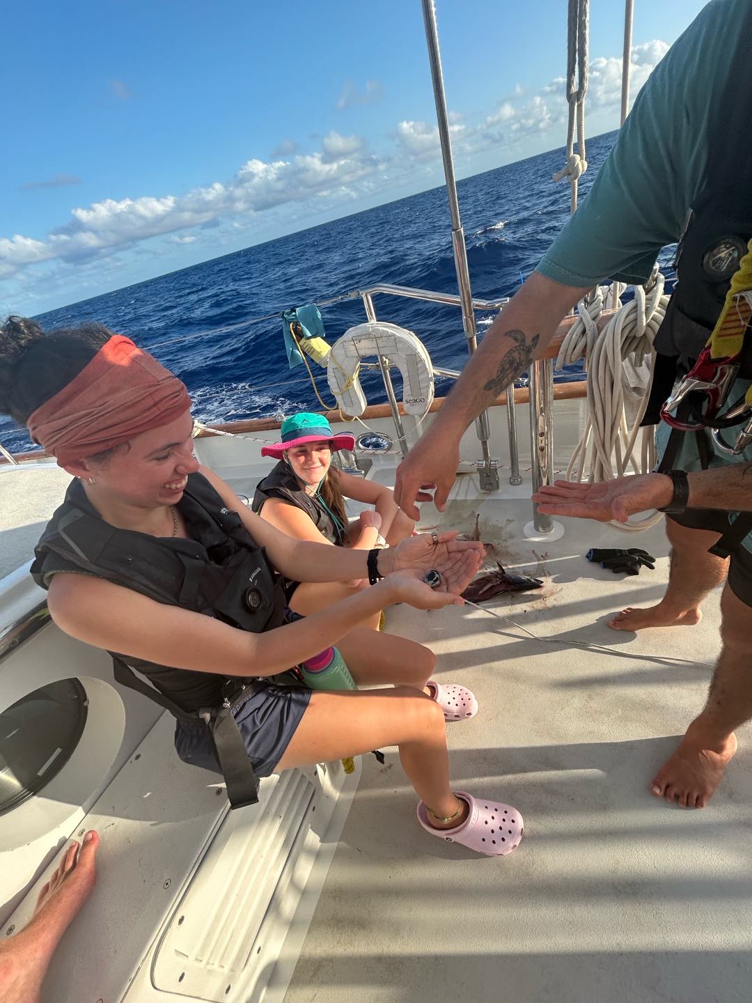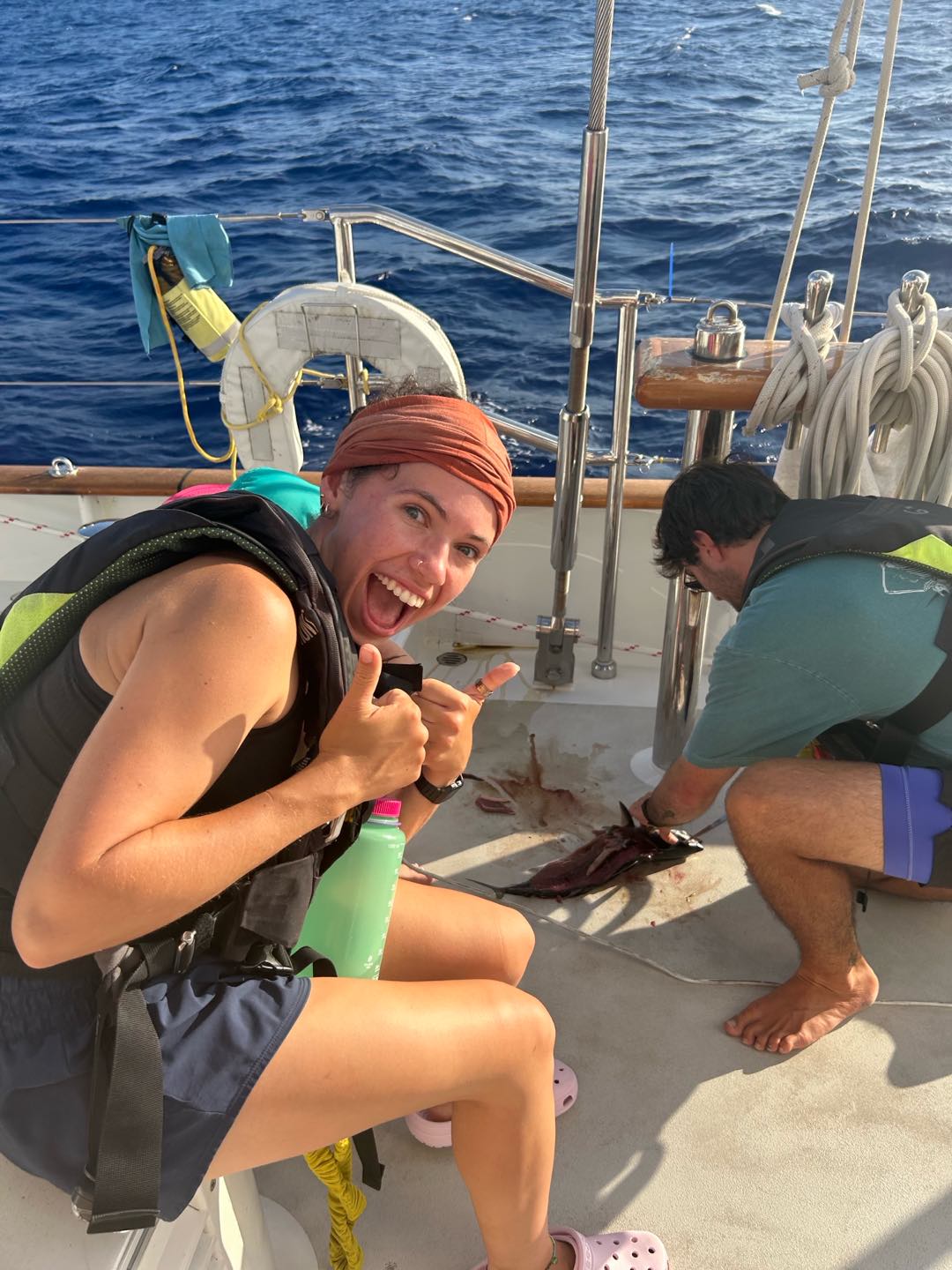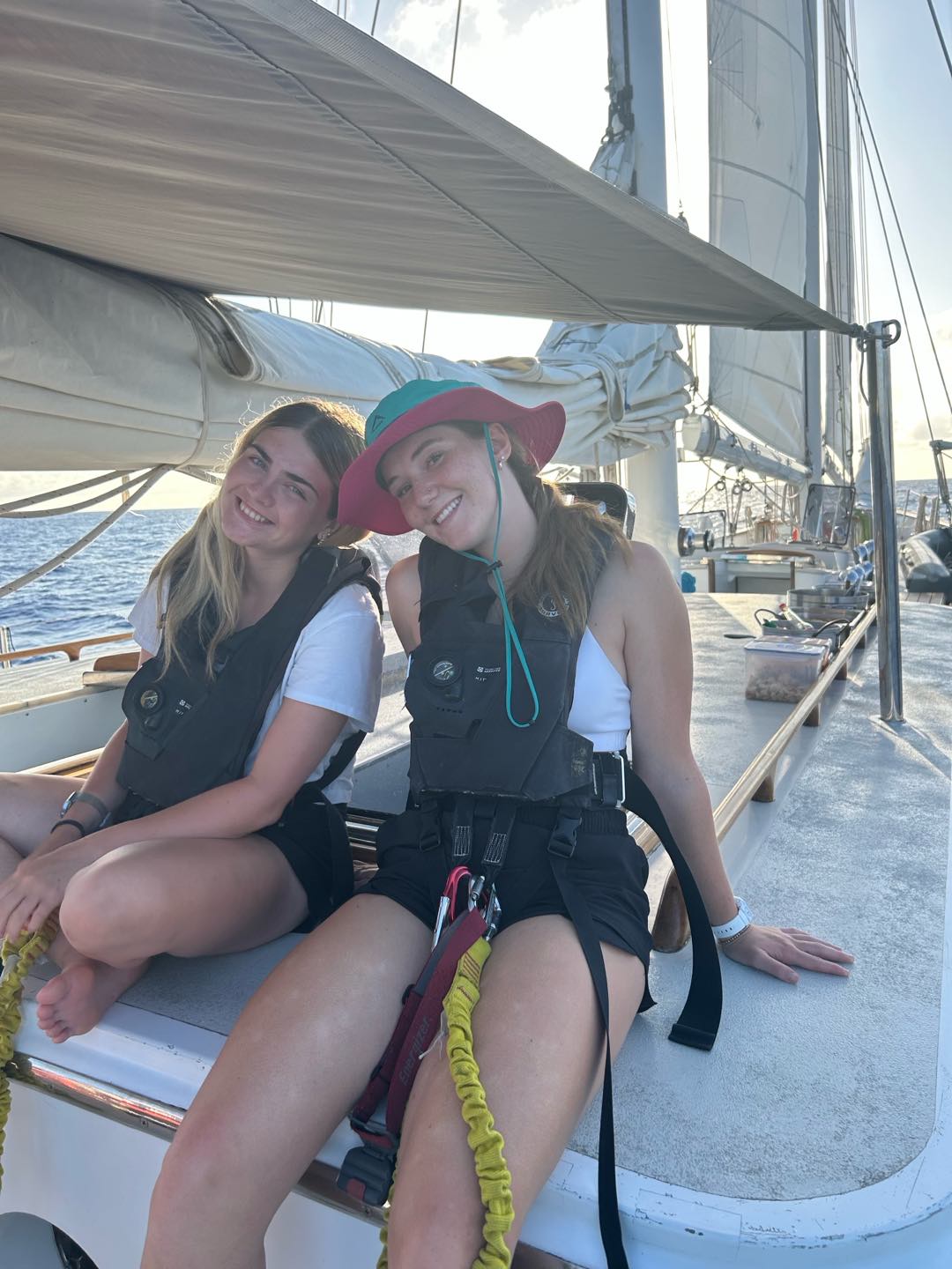 Gooddd morninggg, watch team three(Emma, Perry, Henry, Camilla, and I) and Grant had an early start today with some sail handling. Taking down the mainsail was really fun with just our headlights at four this morning, we did a great job though! Watch team two(Zoe, Kyler, Vittoria, Reed, and Alexa) had an extended watch to help us, which was much appreciated. They also had some stories to tell about taking down the flying jib.