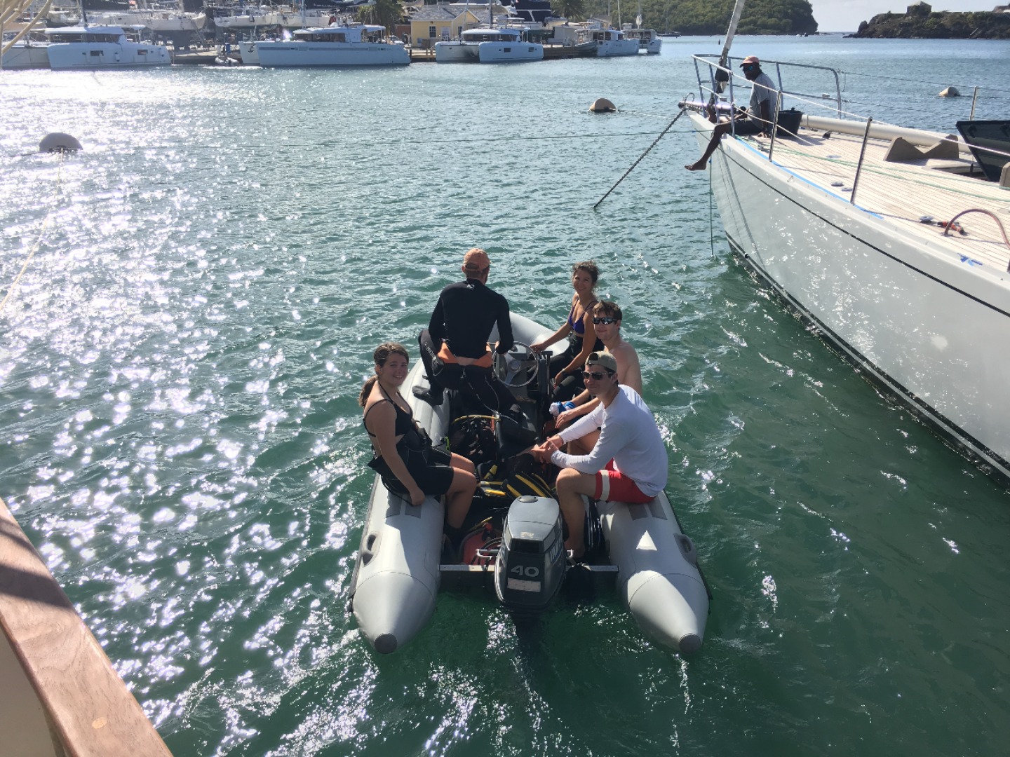 At 7:06 AM, I rolled over in my bunk, confused as to why no one had woken us up. I called Katie in the galley to check and see who the skipper was. She replied, “you.”. Oops. I jumped out of bed and comedically woke up the rest of the crew, almost all of which had already begun to open their eyes. After a lovely yogurt, fruit, and granola breakfast prepared by Ian and Katie, we were all fueled up for the adventures ahead. Following a quick cleanup, the (almost) open water divers prepared for another confined water dive. Those of us who already held certifications were given some free time. I spent most of my time practicing knots, listening to music, and getting a bit too much sun. Peyton, Olivia, and I also went for a short walk around the dockyard, through a small marketplace, a restaurant, and the museum. It was really interesting seeing so many artifacts from this harbor that were hundreds of years old and learning all about the naval history of Nelson’s Dockyard. However, I don’t think I ever really need to read about naval history again with Ian around. You ask him how cannonballs were made back then, and 20 minutes later, you know the entire evolution of British and American canons, a couple of naval battles, and a funny story about how the British defeated the Americans in Boston Harbor.