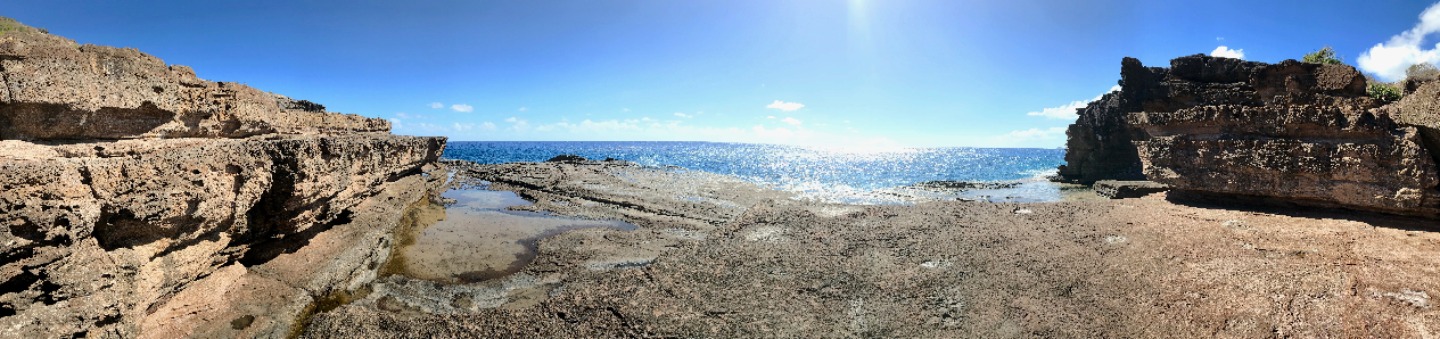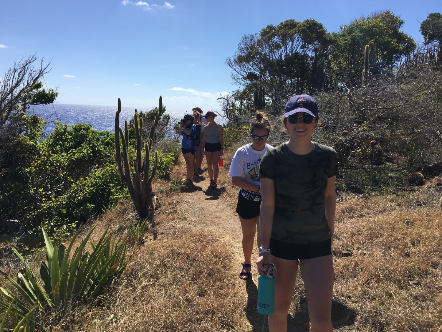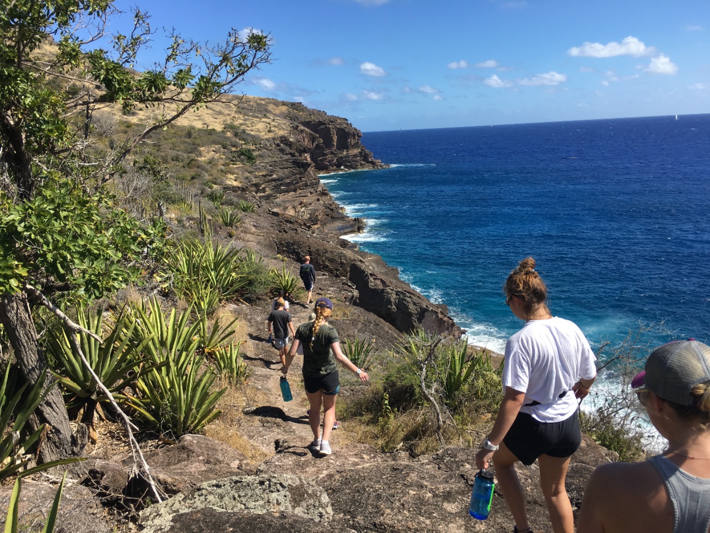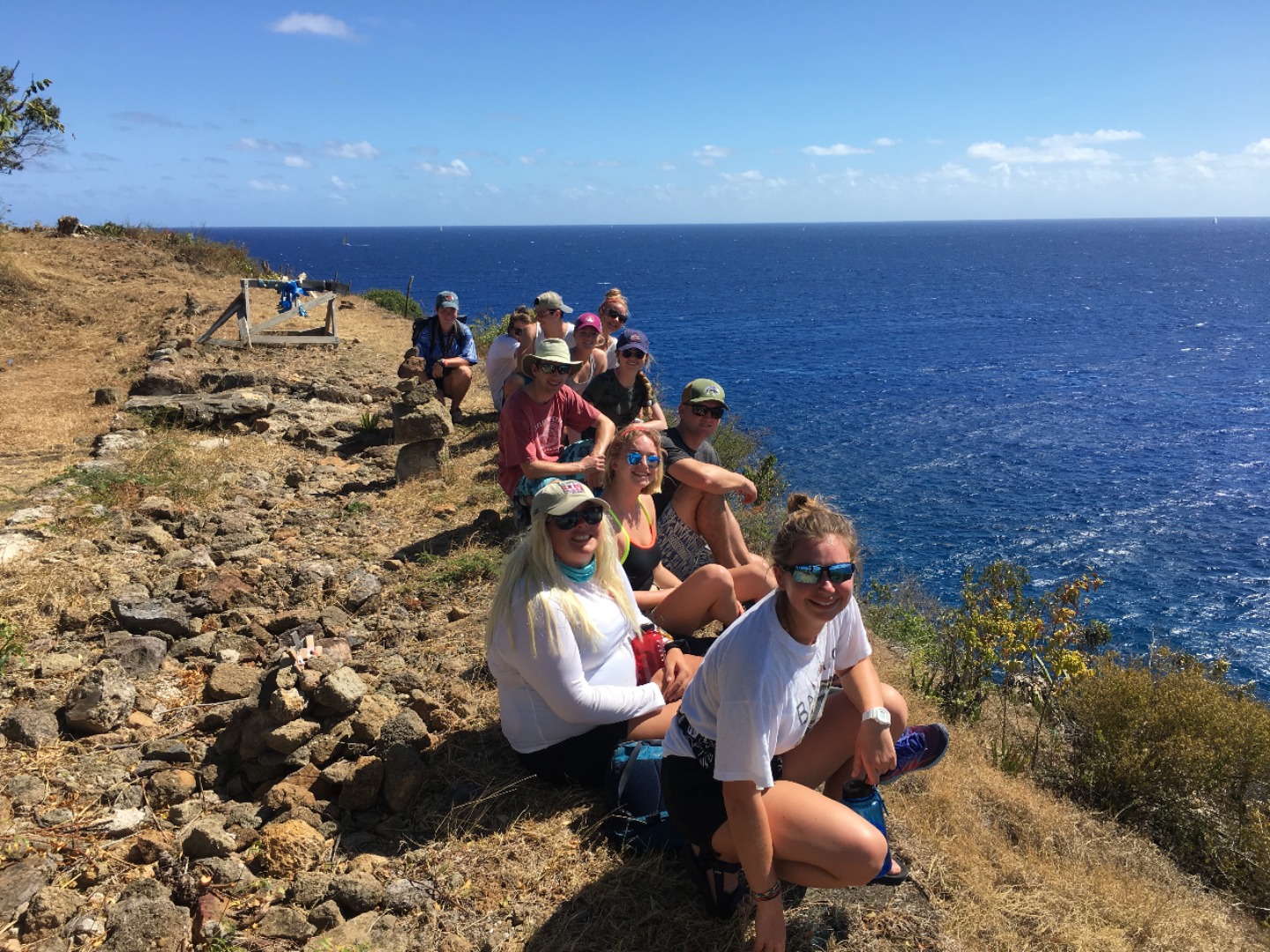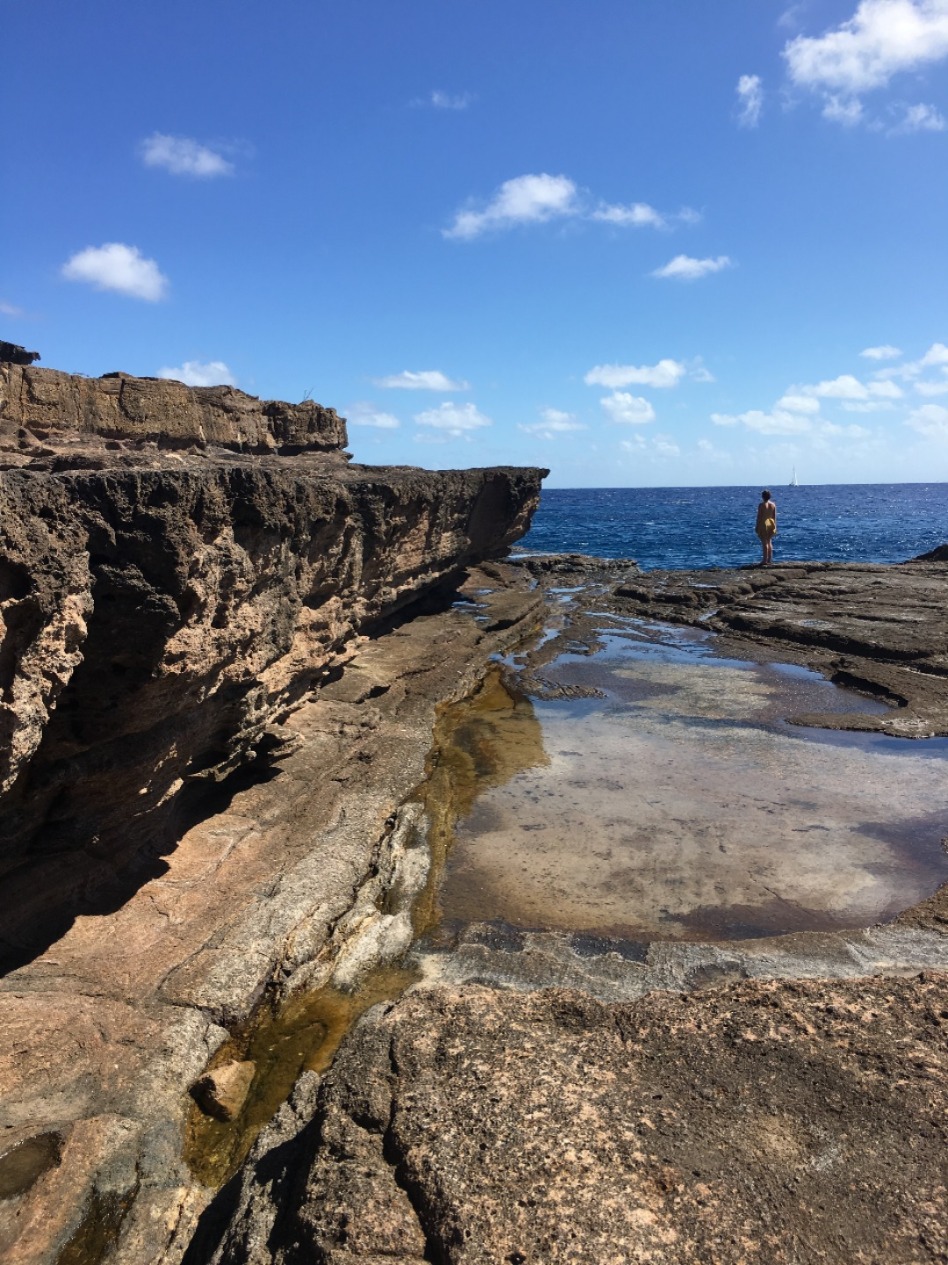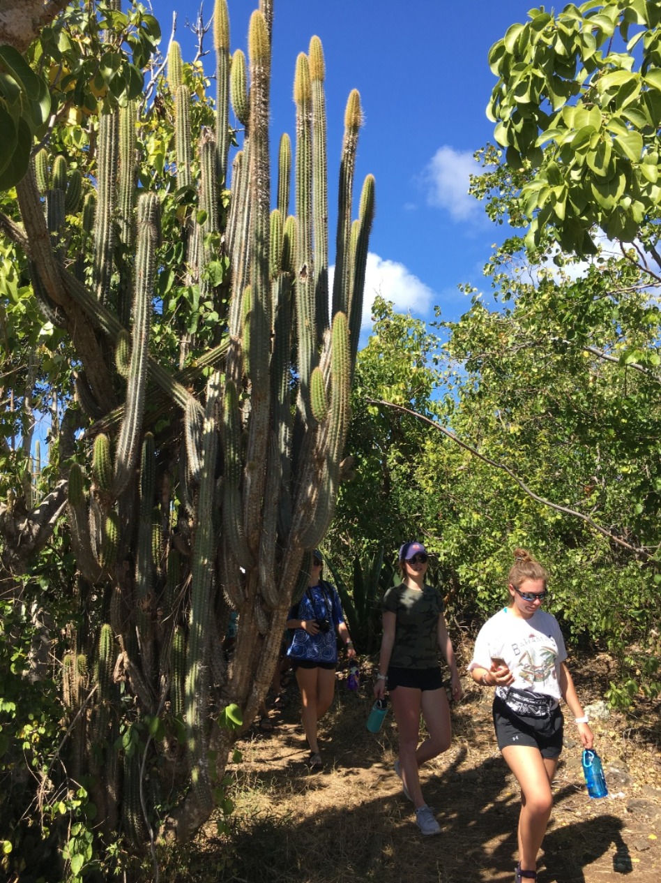 Once the divers returned, we all reconvened for lunch, baked potatoes with butter, cheese, beans, corn, and pineapple? Yeah, I thought it was strange, too, but it was a truly wonderful experience. 12/10 would recommend it to a friend. With the sun reaching its most intense temperature of the day, we decided to venture down the island via Irv, one of our trusty dinghies, for a completely unshaded hike up towards the pillars of Hercules. While on our hike, we were able to explore some small but lively tide pools. Within seconds Steph gleamed with excitement as she spotted the first rather large crab, and later, Matty spotted another. He screamed. Both Steve and Steph taught me about the coral we found and the other organisms in the pools. Fun fact; if a piece of coral is broken off, it can be reattached to any other coral reef, and with a bit of time, it will heal itself and grow an entirely new reef.