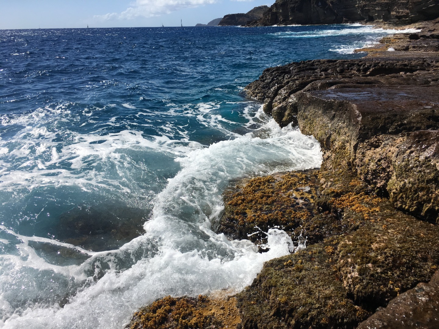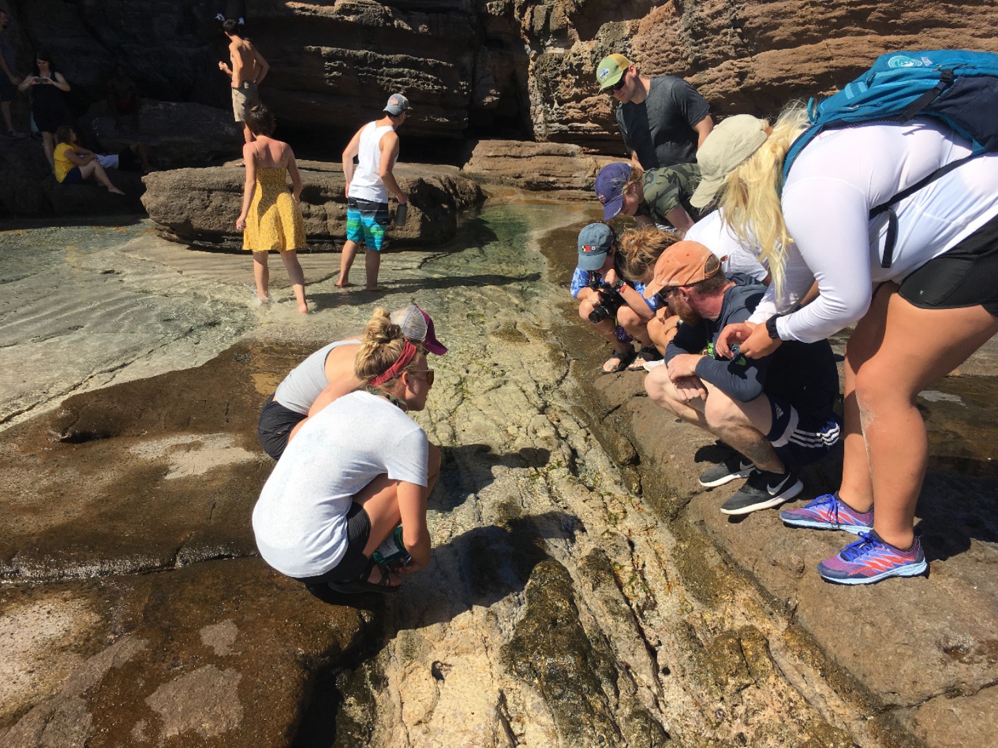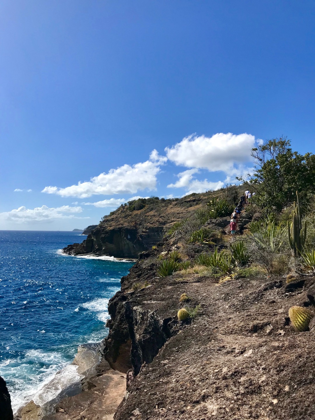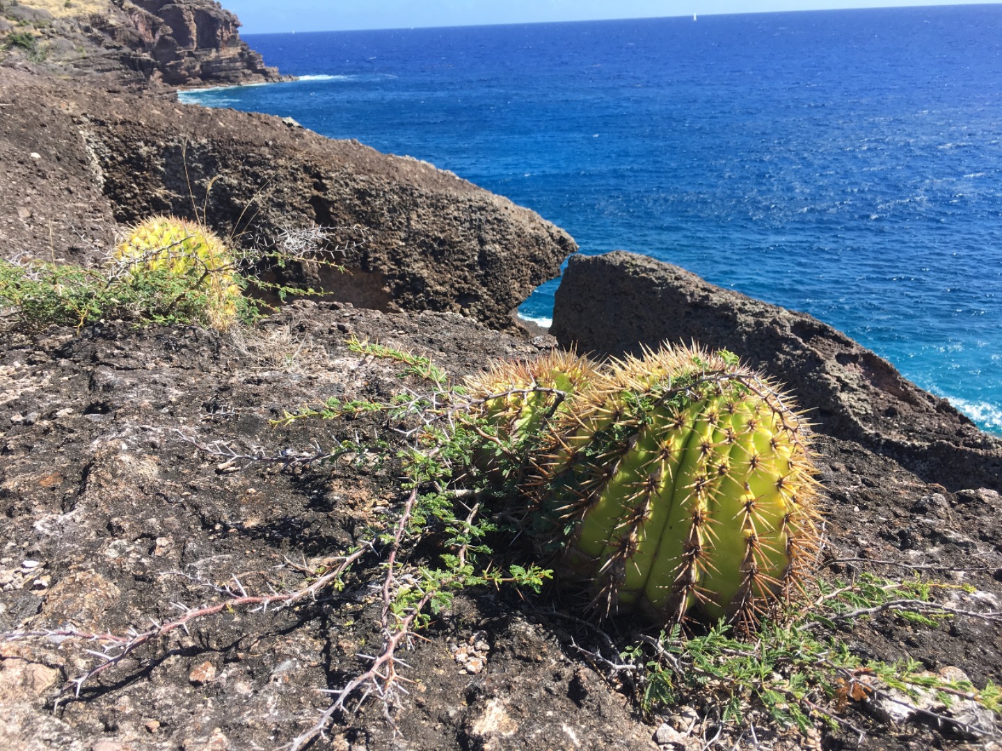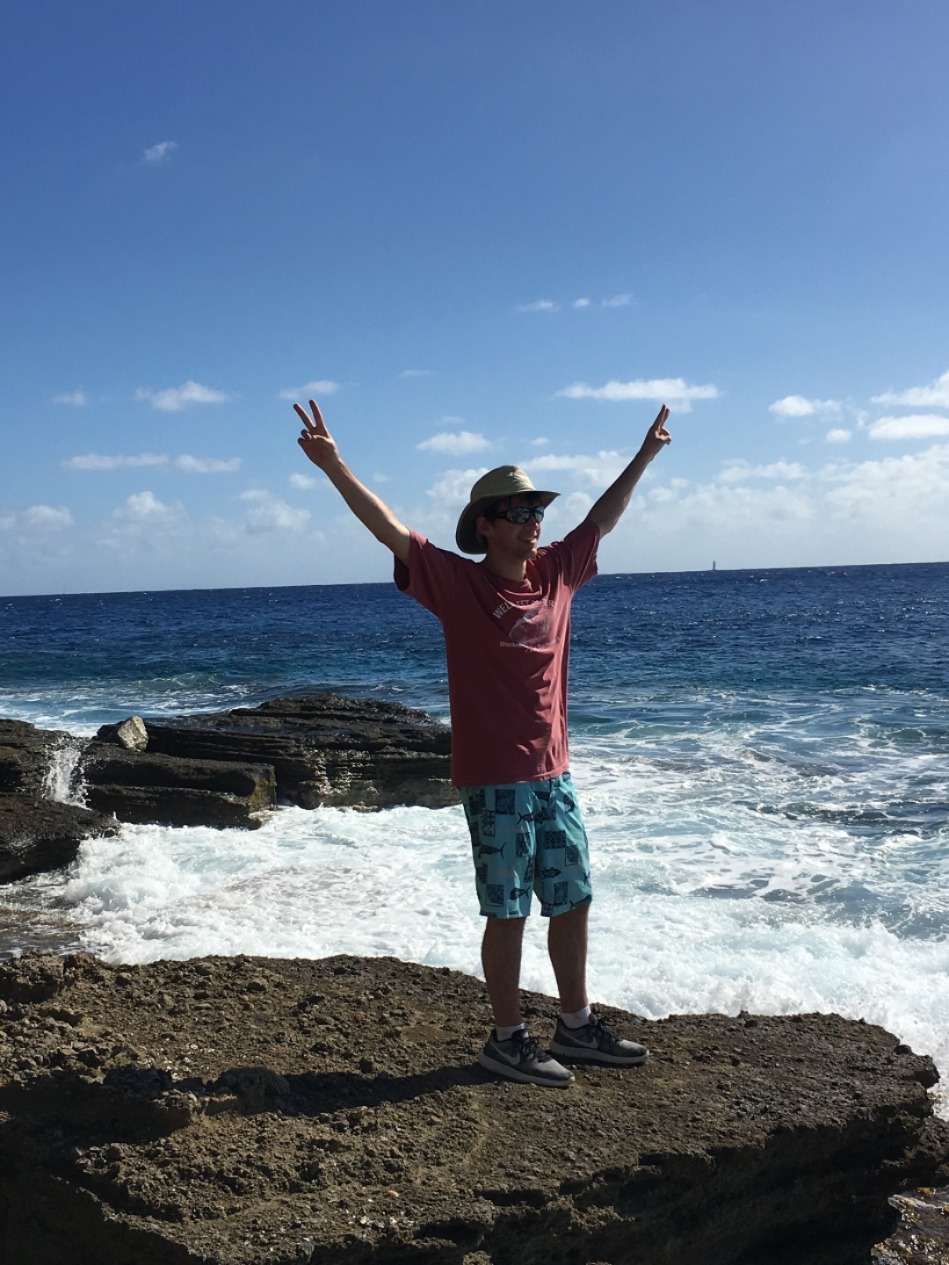 Once the divers returned, we all reconvened for lunch, baked potatoes with butter, cheese, beans, corn, and pineapple? Yeah, I thought it was strange, too, but it was a truly wonderful experience. 12/10 would recommend it to a friend. With the sun reaching its most intense temperature of the day, we decided to venture down the island via Irv, one of our trusty dinghies, for a completely unshaded hike up towards the pillars of Hercules. While on our hike, we were able to explore some small but lively tide pools. Within seconds Steph gleamed with excitement as she spotted the first rather large crab, and later, Matty spotted another. He screamed. Both Steve and Steph taught me about the coral we found and the other organisms in the pools. Fun fact; if a piece of coral is broken off, it can be reattached to any other coral reef, and with a bit of time, it will heal itself and grow an entirely new reef.