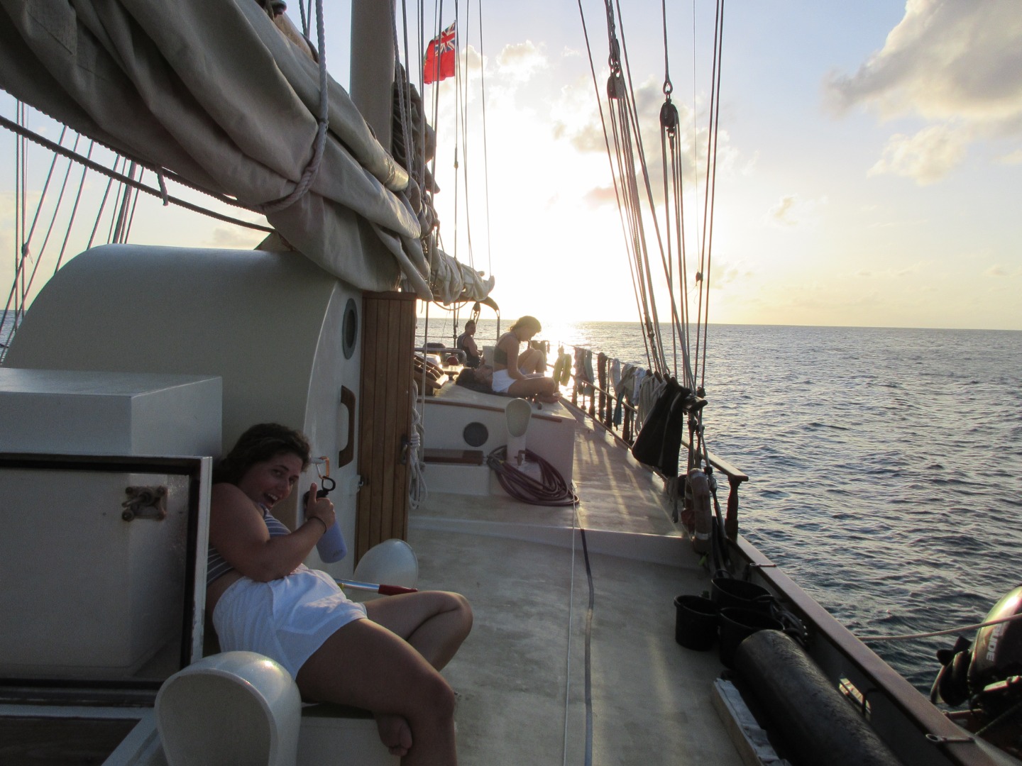 In the afternoon, Nathan and I continued their confined water diving training with Ash. Despite only being a few meters underwater, the experience was magnificent, and some unidentified fish were seen. Unfortunately, they were too quick to be caught 🙁 Ellery almost became PADI diving certified, but not quite yet. Miriam, after her diving session, had to have her BCD lifted innovatively. It was hoisted with the lines used to lift the rafts. Did I mention innovative actually means a hilarious scene to witness in this case? Skipper Justin directed the crew to perform all sweating duties to the chant of Five Guys. Today was a 3/5 stars kind of day!