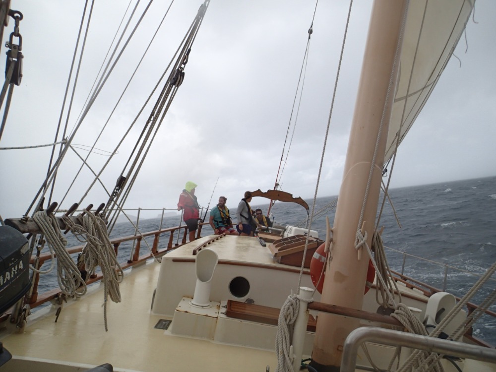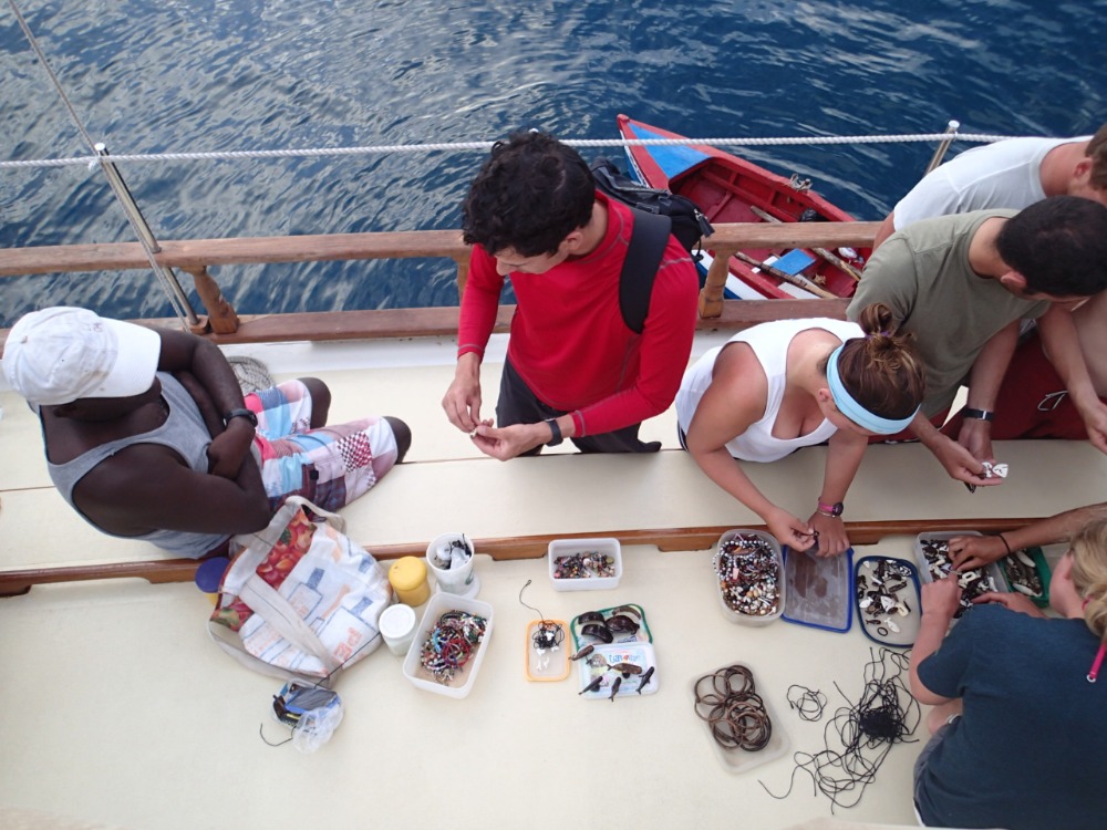 Today on O-Star began early with a hearty breakfast of flapjacks that were done before the staff could say why are you guys eating breakfast at seven instead of seven-thirty? The passage just makes us an overzealous bunch. Departure was rough, with a squall striking just as we hoisted the sails. This meant more knots of wind, rain, and a dash of danger as we neared several unsuspecting catamarans during our exit. We proceeded through the squall and wove through the boats like an expert knitter, Ocean Star being the needle. Adieu, Tobago Cays. The passage was a smooth one; we used five sails sans engine power. As we approached Bequia and started dropping the sails, some squalls rolled in, dousing most of the crew by the time we were in the bay. The crew in the bowsprit even got some additional baths from waves as our schooner tottered through the heightened swells. Anchoring didn’t come easily either; it took several tries for us to hitch onto the ocean floor properly. Once we were anchored and the sails were spruced, Captain Pincus instructed us in the art of chart reading and navigating. Soon afterward, while we settled down to relax for the rest of the day, the fire alarm blared, and we had a surprise crash course on how to use the auxiliary fire hose. By the time the drill was over, we had honed a fair share of our boating skills. Sea|mester’s friendly neighborhood artisan, Willy, stopped by late afternoon to dazzle us with his hand-crafted jewelry; dazzle us he did indeed. We ended the night as we usually do, huddled around the cockpit, grubbing down on some scrumptious eats and conversing through sunset.