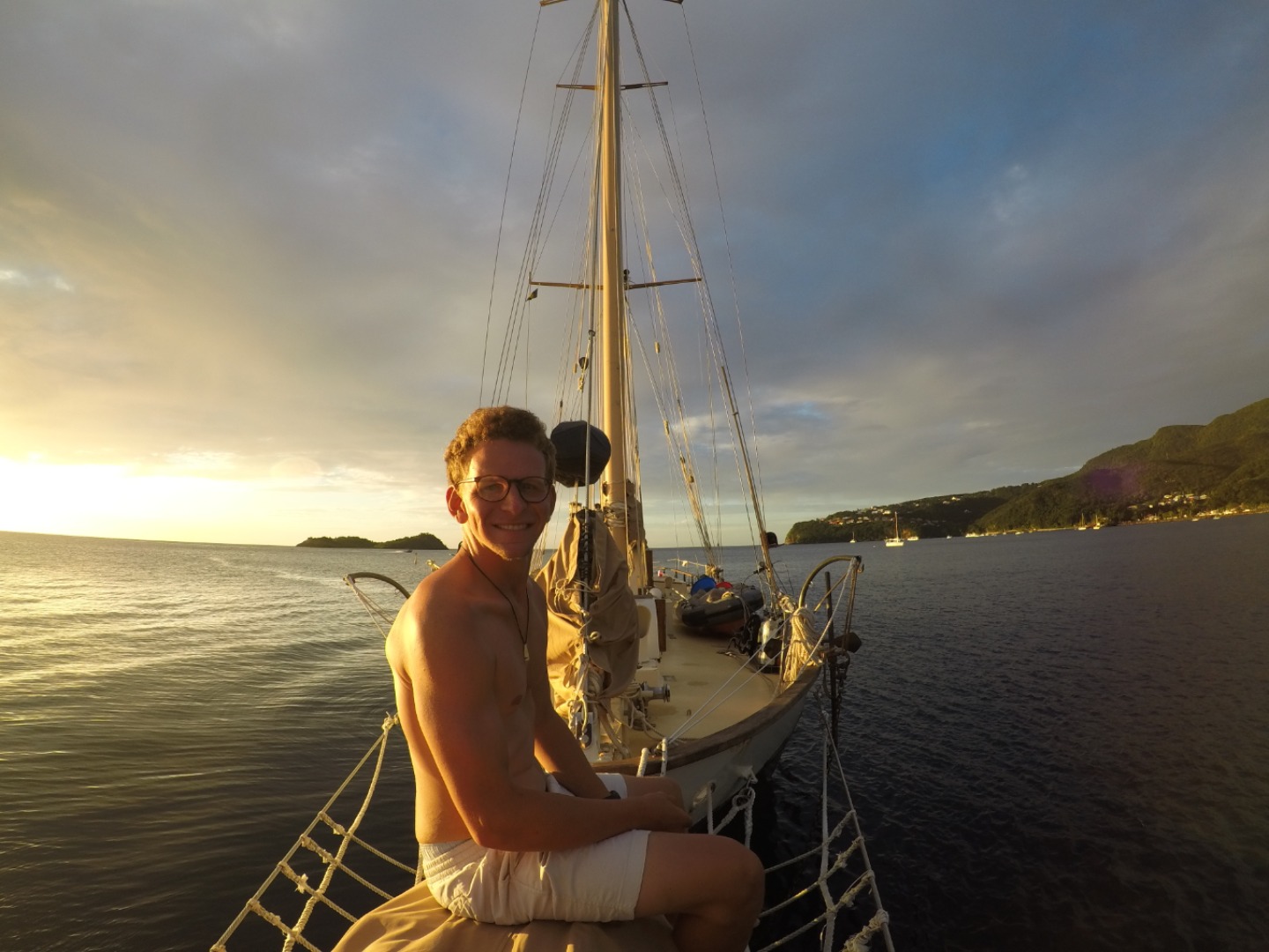 It took me three tries to wake up the crew this morning. The smell of eggs and bacon was the only thing that actually got everyone rolling out of their bunks. After breakfast, we prepared for the passage, then put up the sails and waved goodbye to Les Saintes, wishing we could spend a little longer on the beautiful island of Terre de Haut. On our way to Pigeon Island, we had an oceanography class during which Steph taught us about deep ocean organisms and their adaptations! After class, we all returned up on deck and enjoyed the peaceful sail and clear skies. Shortly after lunch (Steve’s classic pasta bake), we dropped anchor near Pigeon Island. The rest of the afternoon was dedicated to finishing our EFR course. We learned how to save someone from choking and how to assess the person for injuries. After class, we all had four good hours of free time. Everyone got time to catch up on important things – some of us worked on assignments, others exercised or slept; Ian finally got a chance to finish The Lord of the Rings movie. It was a very calm afternoon that transitioned into a great evening with a stunning sunset. The view was breathtaking: a setting sun and pink clouds on the starboard side of us and a rainbow over the mountains on the other. On the horizon, we noticed a sailboat with black sails, surrounded by many small boats with flashing lights. That’s when Captain Ian ran up on deck and told us that it was Franois Gabart on MASIF, finishing their crossing of the Atlantic Ocean from France to Guadeloupe. It took him seven days to cross the Atlantic, starting in Brittany, with an average speed of 40-50 knots. We were all very intrigued by this story. While everyone else was taking pictures and admiring the ship as it was passing by, Captain Ian and Carolyn jumped into Irv to get a closer look. Being the only one who noticed, I also jumped in without hesitation. Planning in Irv, we were soon facing a 120ft boat. The only thought that I could actually think clearly was, “Woah.” After a delicious dinner of toad in a hole (Yorkshire pudding with sausages integrated), we did “squeeze.” I asked everyone if they had met themselves ten years ago, what advice would they give themselves? Following the cleanup, we had a marine bio lecture, which was a good last event before a good night’s sleep.