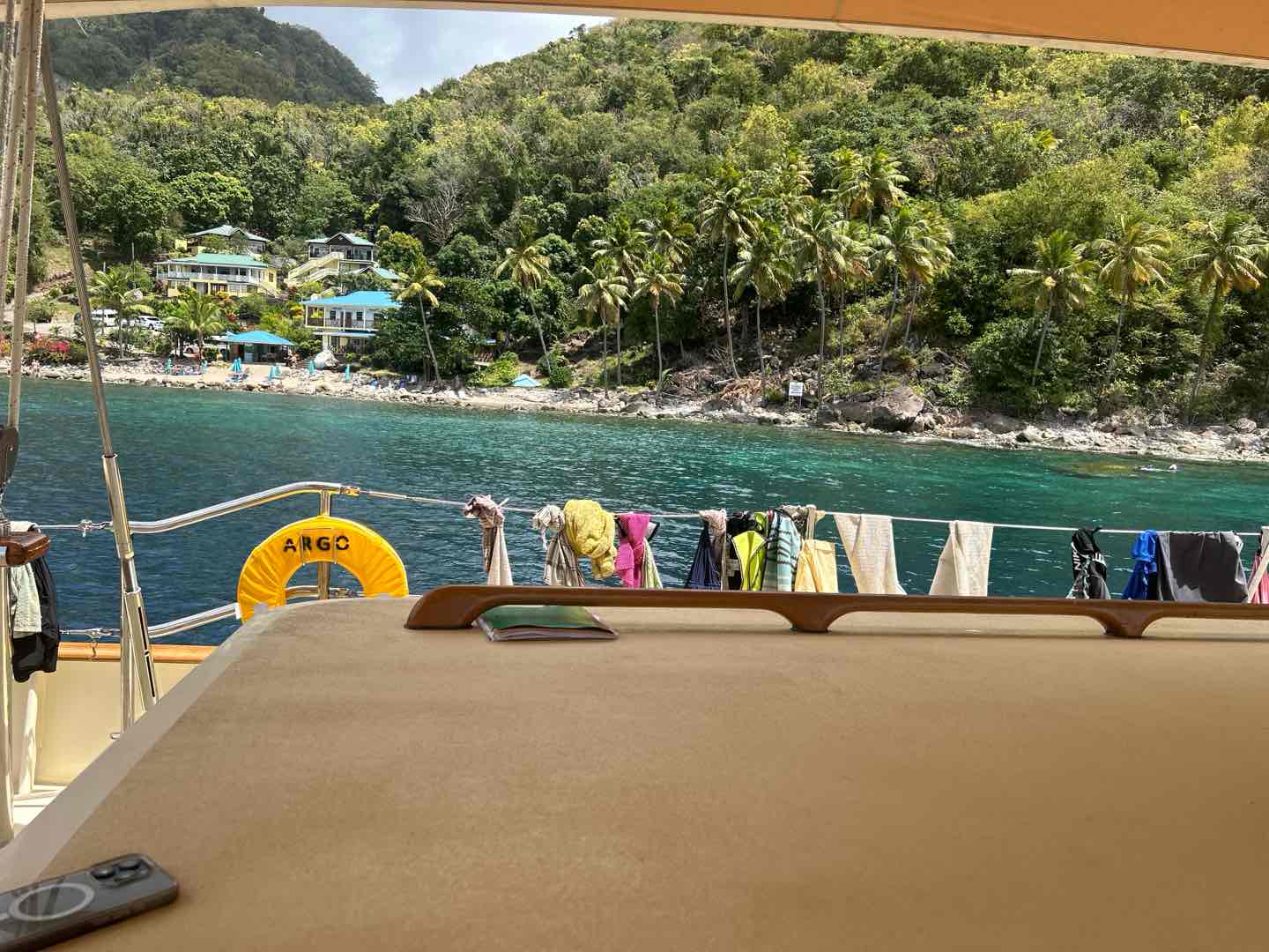The hearty crew of Argo, after completing the normal evening squeeze/clean-up ritual, once again prepared to face high seas on what was to be a thrilling, however short, crossing up the windward side of St. Vincent across and into the wind shadow of the Piton mountains of St. Lucia. At around 21:00, the crew slipped Argo’s mooring lines (with some difficulty) and prepared to set our canvas. Our chief mate and notable “galley worker”, Kackie, had a surprise in store for the crew; there was to be a sail raising race.
