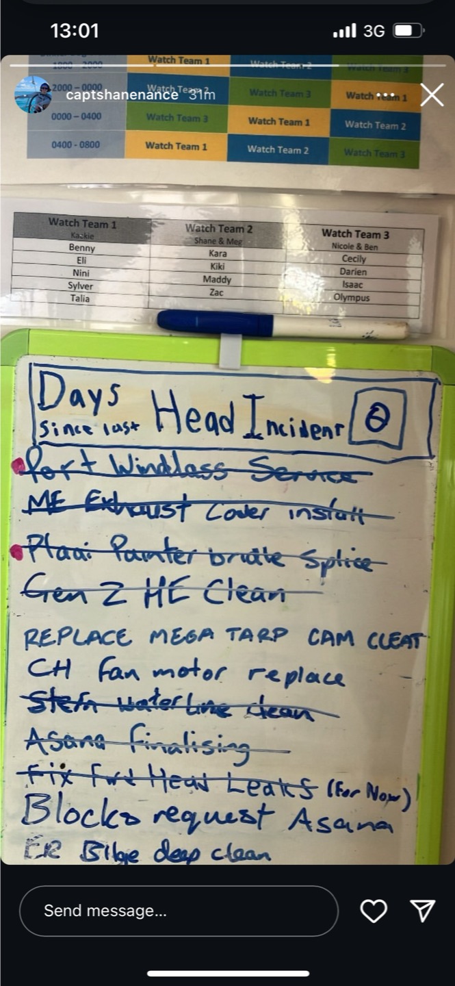 Watch team two, Meg’s and my team, had the 0400-0800 watch and took over command during a hectic squall with gale force winds sustaining 35-40 knots. Though the squall passed quickly, the sea state and wind force remained lively throughout the rest of our passage. I had a particularly proud dad moment when I sent a contingent of my team lead by Kiki and comprised of Zac, Maddy, and special guest Dave (Kara was on a boat check) with orders to simply trim our sails for maximum speed. With no further instruction, the trimming squad headed up to the bow. As they trimmed sails one at a time, I watched our speed slowly climb from a respectable 7 knots to a brilliant 9.5-10 knots. It’s absolutely lovely to see the students really get the hang of making Argo perform at her best.