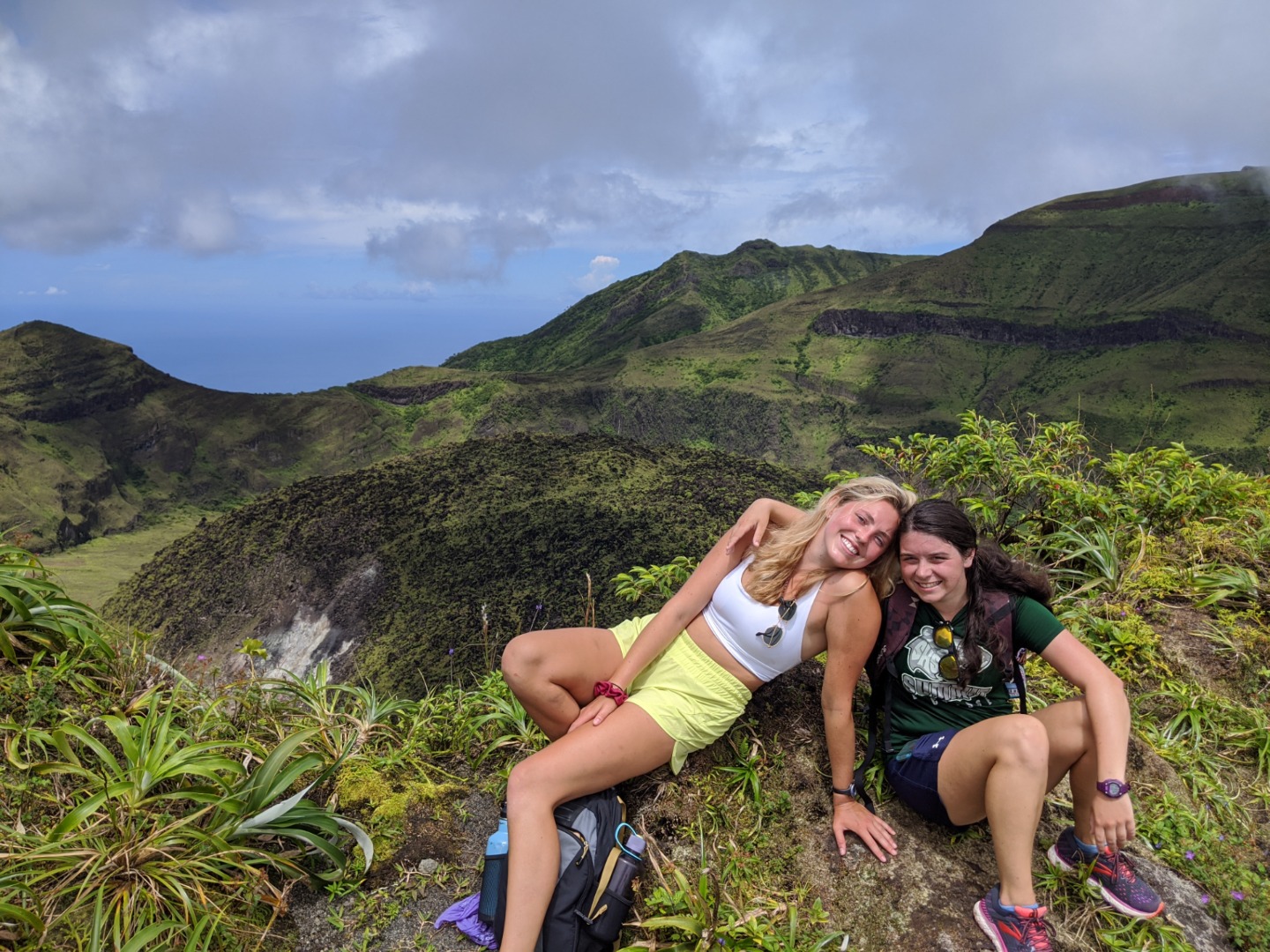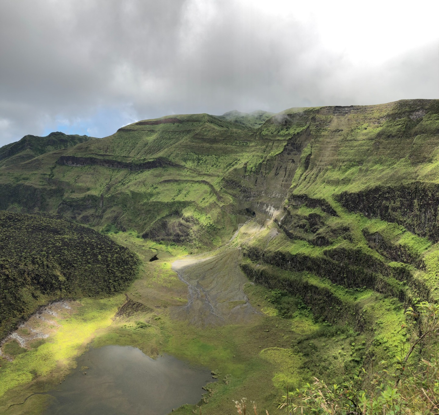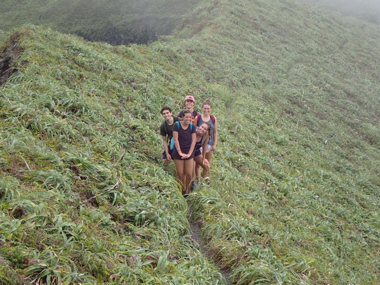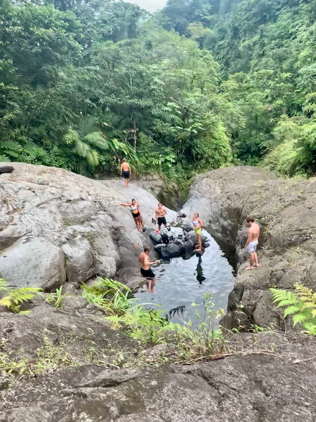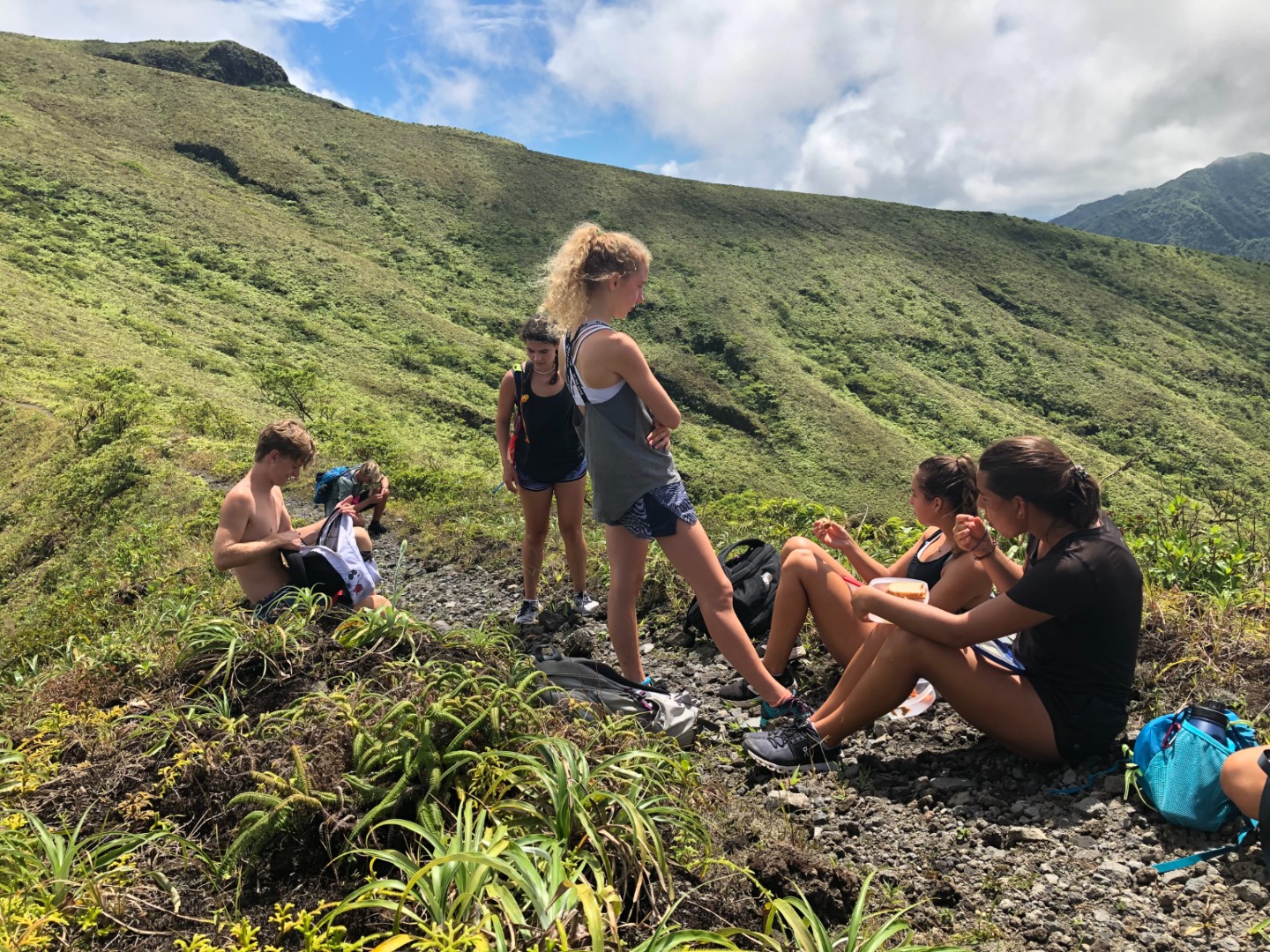 “What about some water? That’s a matter of health, you know,” whispered my throat. No, I told myself onward. And onward I went. Soon I caught up with Pearse and Zac, who were sitting on a bank. They were on the brink of giving in. “This is cap. They totally sugar-coated this,” said Pearse. Zac only stared. The heat must have gotten him. Still, I continued onwards, upwards, until I finally arrived at Julia and Zoe. Who, between pants, were studying for our oceanography quiz. We paused for some sweaty selfies before continuing on. “Julia,” I lamented, “I feel like as soon as we reach the top of the ridge, there’s just going to be another bigger, meaner ridge.” I have never been happier to be wrong. The top of that ridge was the rim of the volcanoa spectacular sight, full of soft greens. Sulfuric smoke wafted up as shifting clouds reached down. After a long rest, we continued on the trail around the rim and looked for a place to stop for lunch. Lunch was gorged on. On the way down, we all slid and slipped, and I worked my way down very, very slowly with Calum and Mike. Together we stumbled upon the rest of the group jumping into a deep waterhole. I took a swim myself, and I can confirm that the crisp cool water was beyond refreshing.