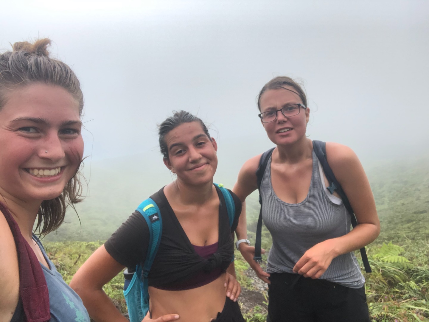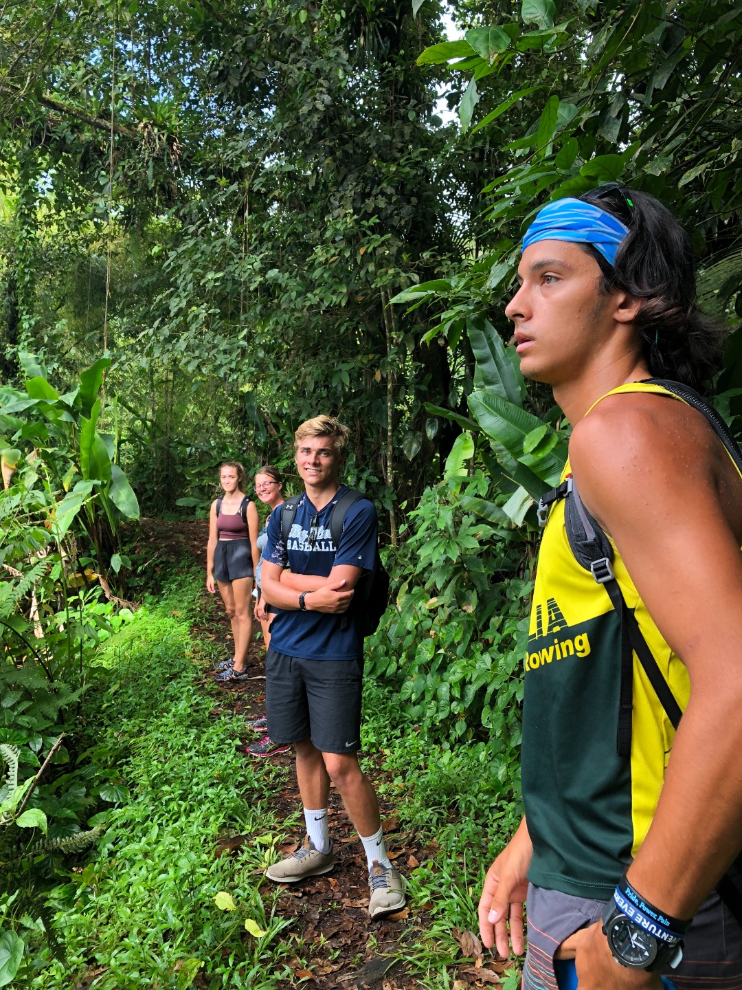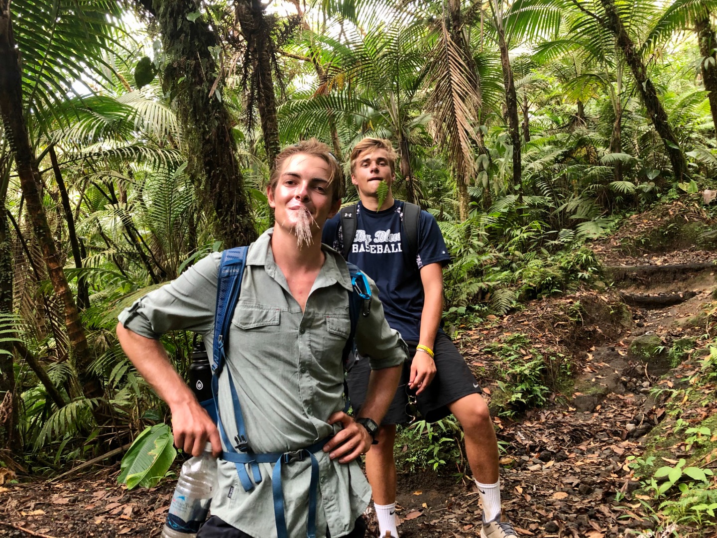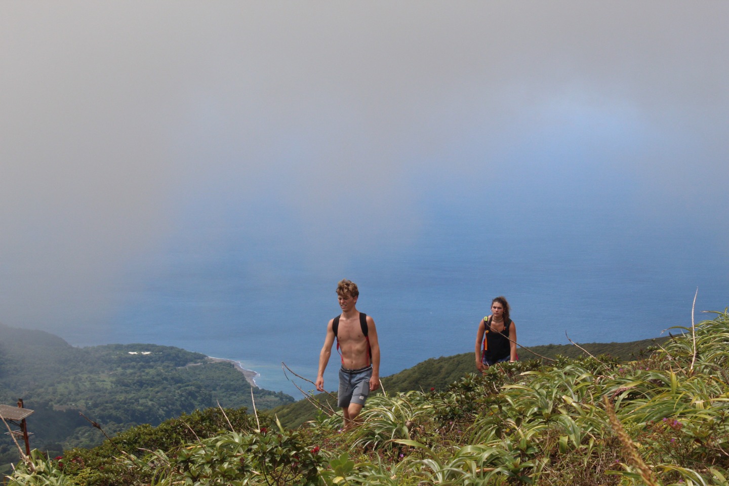 “What about some water? That’s a matter of health, you know,” whispered my throat. No, I told myself onward. And onward I went. Soon I caught up with Pearse and Zac, who were sitting on a bank. They were on the brink of giving in. “This is cap. They totally sugar-coated this,” said Pearse. Zac only stared. The heat must have gotten him. Still, I continued onwards, upwards, until I finally arrived at Julia and Zoe. Who, between pants, were studying for our oceanography quiz. We paused for some sweaty selfies before continuing on. “Julia,” I lamented, “I feel like as soon as we reach the top of the ridge, there’s just going to be another bigger, meaner ridge.” I have never been happier to be wrong. The top of that ridge was the rim of the volcanoa spectacular sight, full of soft greens. Sulfuric smoke wafted up as shifting clouds reached down. After a long rest, we continued on the trail around the rim and looked for a place to stop for lunch. Lunch was gorged on. On the way down, we all slid and slipped, and I worked my way down very, very slowly with Calum and Mike. Together we stumbled upon the rest of the group jumping into a deep waterhole. I took a swim myself, and I can confirm that the crisp cool water was beyond refreshing.
