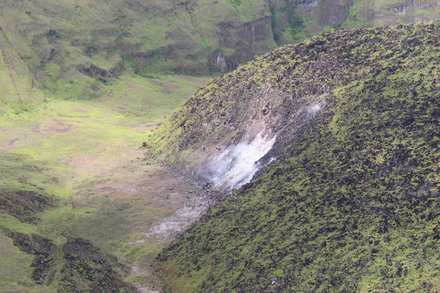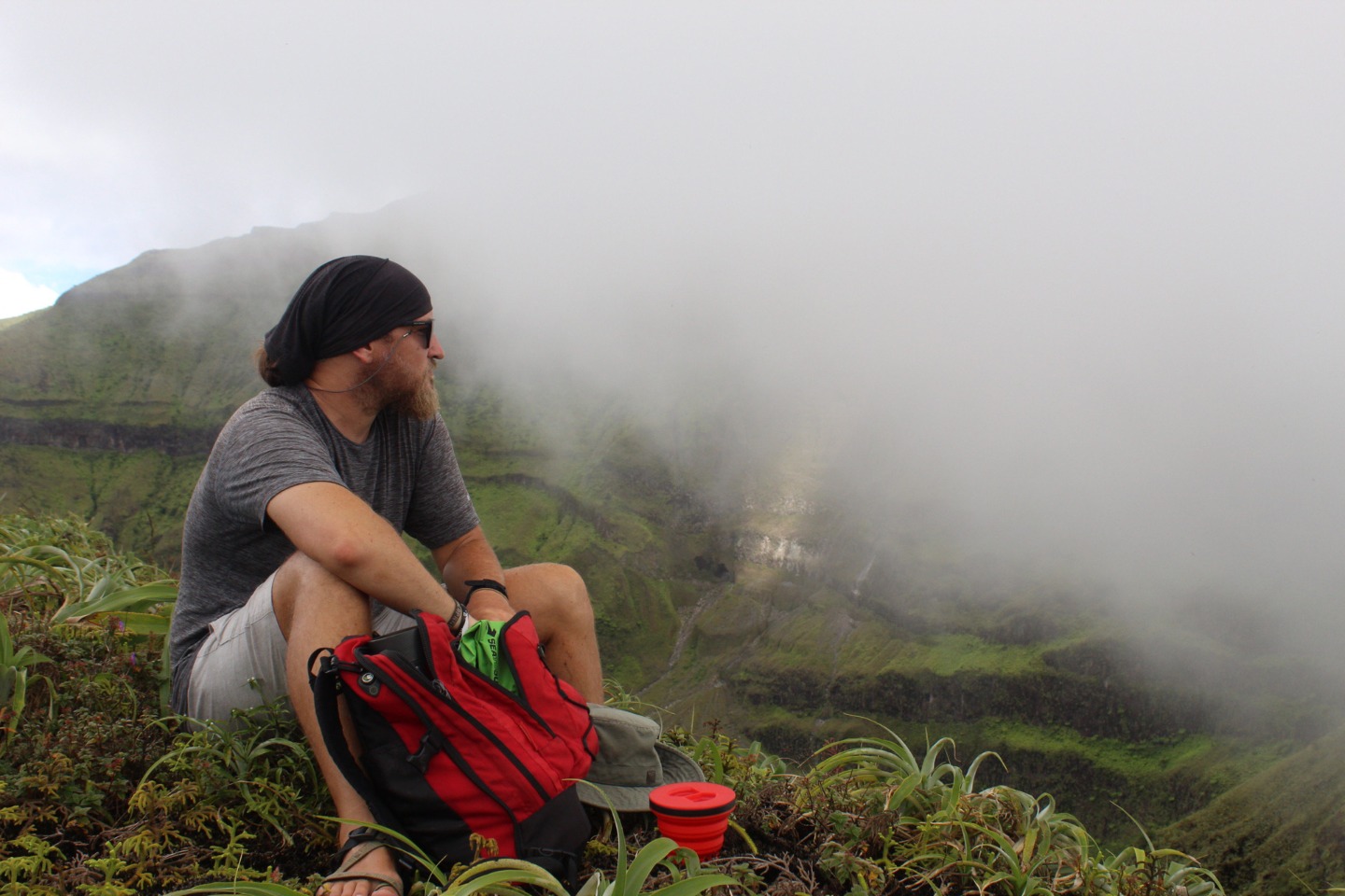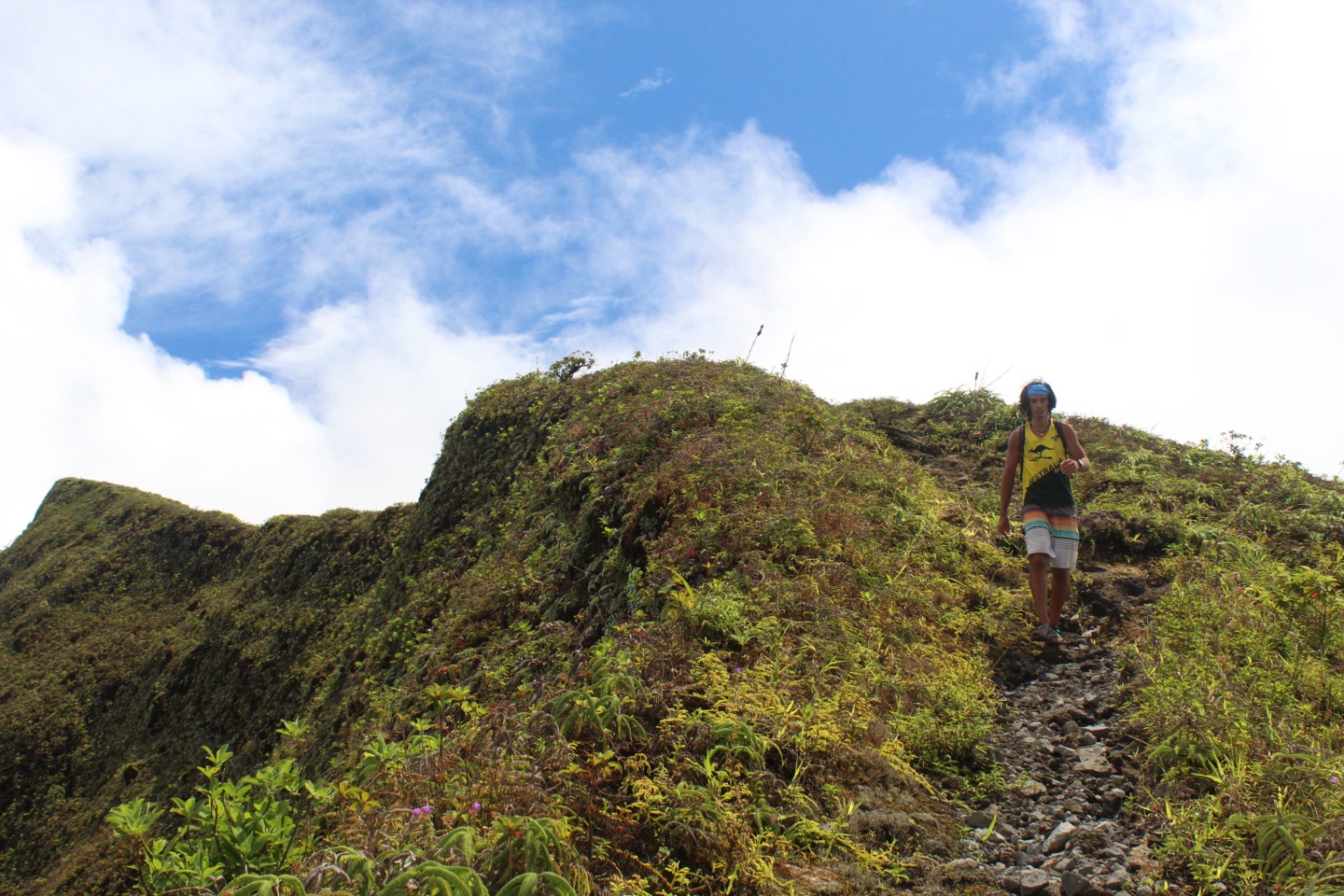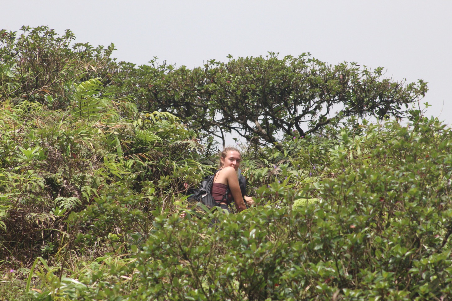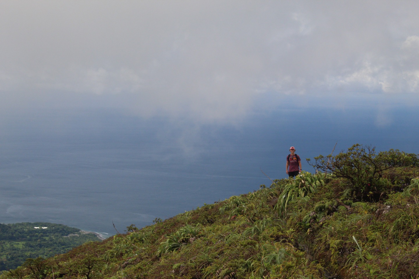 “What about some water? That’s a matter of health, you know,” whispered my throat. No, I told myself onward. And onward I went. Soon I caught up with Pearse and Zac, who were sitting on a bank. They were on the brink of giving in. “This is cap. They totally sugar-coated this,” said Pearse. Zac only stared. The heat must have gotten him. Still, I continued onwards, upwards, until I finally arrived at Julia and Zoe. Who, between pants, were studying for our oceanography quiz. We paused for some sweaty selfies before continuing on. “Julia,” I lamented, “I feel like as soon as we reach the top of the ridge, there’s just going to be another bigger, meaner ridge.” I have never been happier to be wrong. The top of that ridge was the rim of the volcanoa spectacular sight, full of soft greens. Sulfuric smoke wafted up as shifting clouds reached down. After a long rest, we continued on the trail around the rim and looked for a place to stop for lunch. Lunch was gorged on. On the way down, we all slid and slipped, and I worked my way down very, very slowly with Calum and Mike. Together we stumbled upon the rest of the group jumping into a deep waterhole. I took a swim myself, and I can confirm that the crisp cool water was beyond refreshing.
