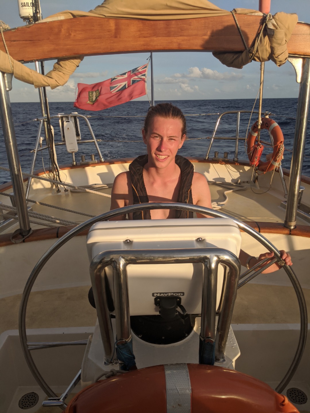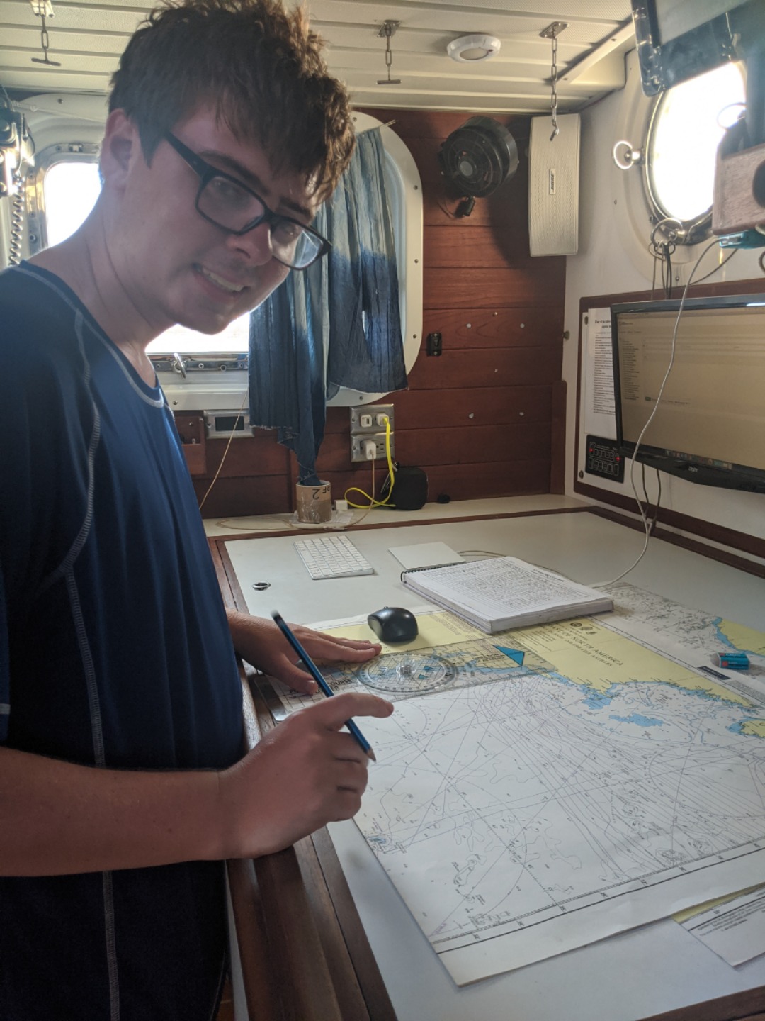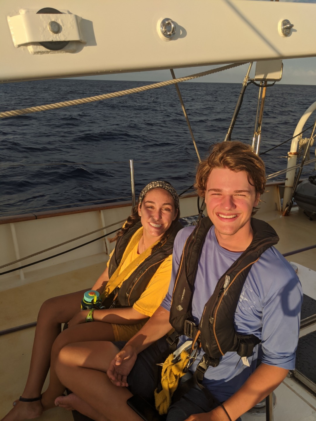 We have had a very exciting day underway. It all kicked off at 0400 when Watch Team 3 came up on deck to find that the wind had finally filled the sails once again. Watch Team 2 was busy easing sheets and setting up running backstays while Katie, our fearless watch team leader, briefed us at midships for our watch. The 0400-0800 watch is my favorite because when you first step on the deck, you are often greeted by shooting stars, and then we get to witness the night sky slowly brighten as the sun rises. It’s a great way to start the day. The only wildlife we spotted today, as far as I know, was a lonely Booby bird, but hey, you can’t spot whales every day. As the watch rotations continued throughout the day, lots of games were played, many sleepy faces popped up through the companionways to assess the status of the weather, and we all took a turn on the helm. We also got to do a lot of sail handling as the wind would pick up and die off throughout the day. Jake and Claudia worked their magic in the galley and made us some incredible meals for lunch and dinner. Once dinner finished, everyone shared their favorite outdoor memory during squeeze and then got busy with the cleanup. The day is now winding down as everyone tries to catch some hours of sleep before their night watches.