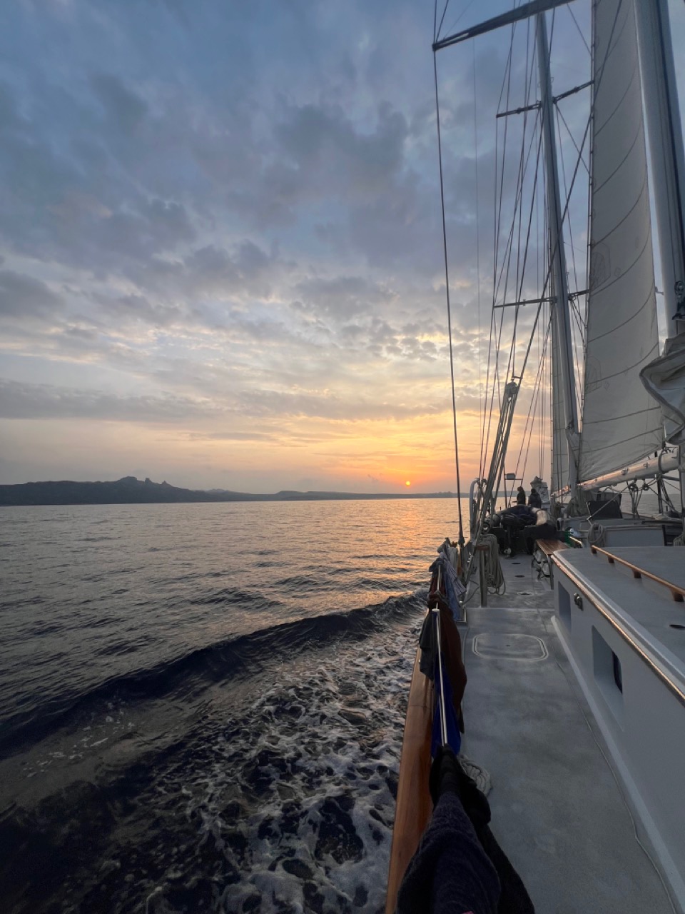 We woke up to a lovely spread of CAULIFLOWER and lots of it! Yum. After lunch, cleaning up, and sweating our asses off, we set up the swim ladder for a much-needed swim. The water is so much saltier here! We had some beautiful jumps twists, and dives off the bowsprit as per usual, along with a most perfect dive competition between Nate & Mac, judged by Will. Mac won a battle, but Nate did win the war. Even Mac couldn’t deny how beautiful that dive was, as he expressed, “Damnitt!” just as Nate went under.