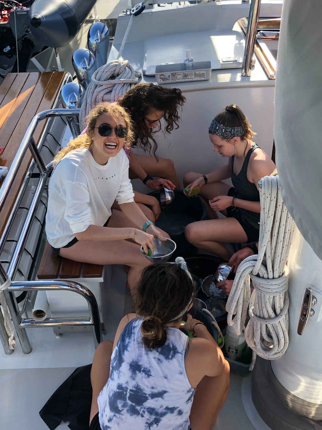 Photo 3: Salties (Sonnet, Maddie, Valentina) dryers, and Freshie (Will) making sure we have clean plates for tomorrow.