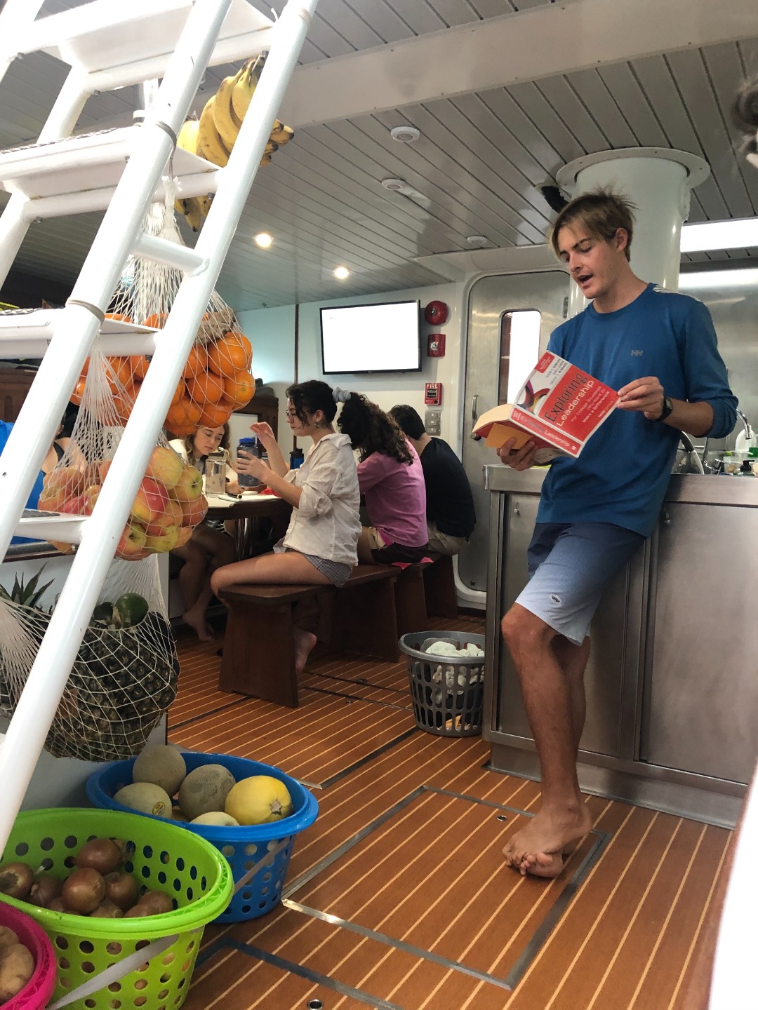 Photo 2: Shona giving Colm, Mackenzie, Ethan, Andrea, and Hannah real-life examples and a walkthrough of the boat and its’ terms.