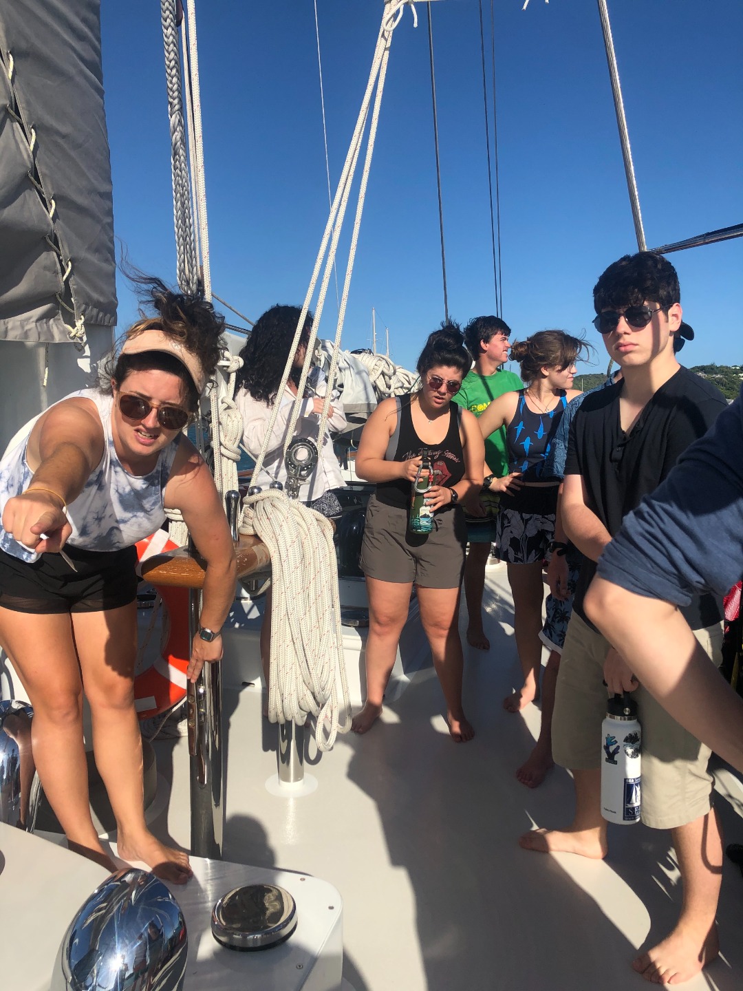 Woke up this morning after doing an anchor watch with Charles, with beautiful views of Antigua once again. As a skipper, it was my responsibility to wake up the crew bright and early so we can have breakfast and begin our duties on the boat. After cleaning up breakfast, we gathered in the saloon for our first leadership class. After a brief introduction to what to expect from the course, we participated in an exercise where each person from the crew picked a song that was played through the saloon speakers, ultimately creating a playlist of songs from the crew. You could tell everyone enjoyed listening to music from the crew. Shortly after, we divided into two groups; those who are already certified went on to the deck for dinghy training. The other half stayed in the saloon to finish up our open water education from the previous day. For lunch, we had lunch meat sandwiches with amazing views again. After cleaning up the lunch, we met back in the saloon for oceanography class with Leoni. in class, we discussed topics for our research project/presentation. I signed up to research fisheries not only because I am passionate about fishing but also because I would like to learn how fisheries have been affected over the years and what will happen with the fishing industry in the future. For our seamanship class, we learned about our own boat Vela and how sailing boats have evolved over the years; for the second part of the class (which was my favorite), we got to go on deck and learn the terminology and functions of our ship. After being done with classes for the day, it was finally time to take a dip!!!!! The water felt very refreshing, with a beautiful sunset covering us with gold. Maddy and Anthony, with the help of Smash, cooked the crew a healthy dinner (with some Pringles on the side). As a skipper, it was my job to come up with a question for our squeeze circle after dinner. I asked the question, “if you could domesticate any animal, what would it be.” There were many interesting answers, but my favorite was when Hannah said “giraffe” so she could ride it because it can walk over everything. To finish our day, those who are not certified will take a final exam for PADI certification and soon will be able to enjoy the underwater world.