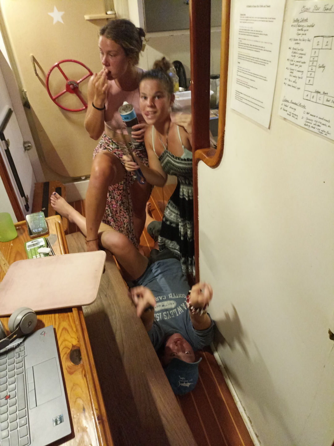 We started off with an amazing homemade French toast by Katie (I think she got some sleep last night), then split ourselves into three (as in three groups of 4 or 5 people, didn’t actually split ourselves). While two groups went on shore, the people in the third one navigated their way through the Navmaster exam (see what I did there?). Then we swapped and swapped again. The various shore activities included eating, exploring Fort Oranje, eating, walking around town, eating, hanging out in the shade, eating, playing with stray cats and chickens, or just eating without having to clean up. Back on the boat, we got greeted by a cheffing Katie, and two hours later devoured her chicken popcorn with pineapple stuffing. After dinner, we voted on our Skipper, Navigator, and Mates for the upcoming student lead passage. May the best Sailor win