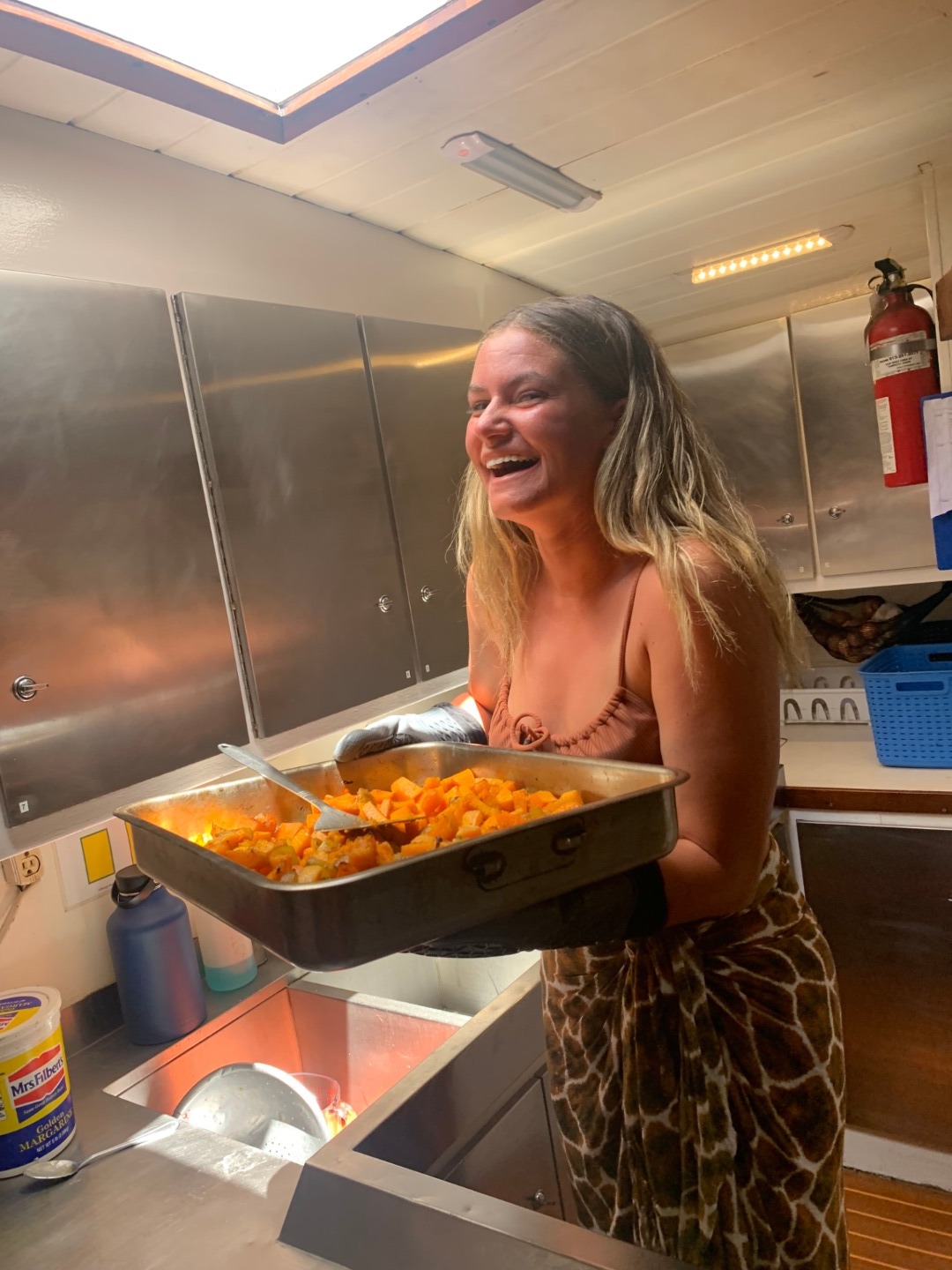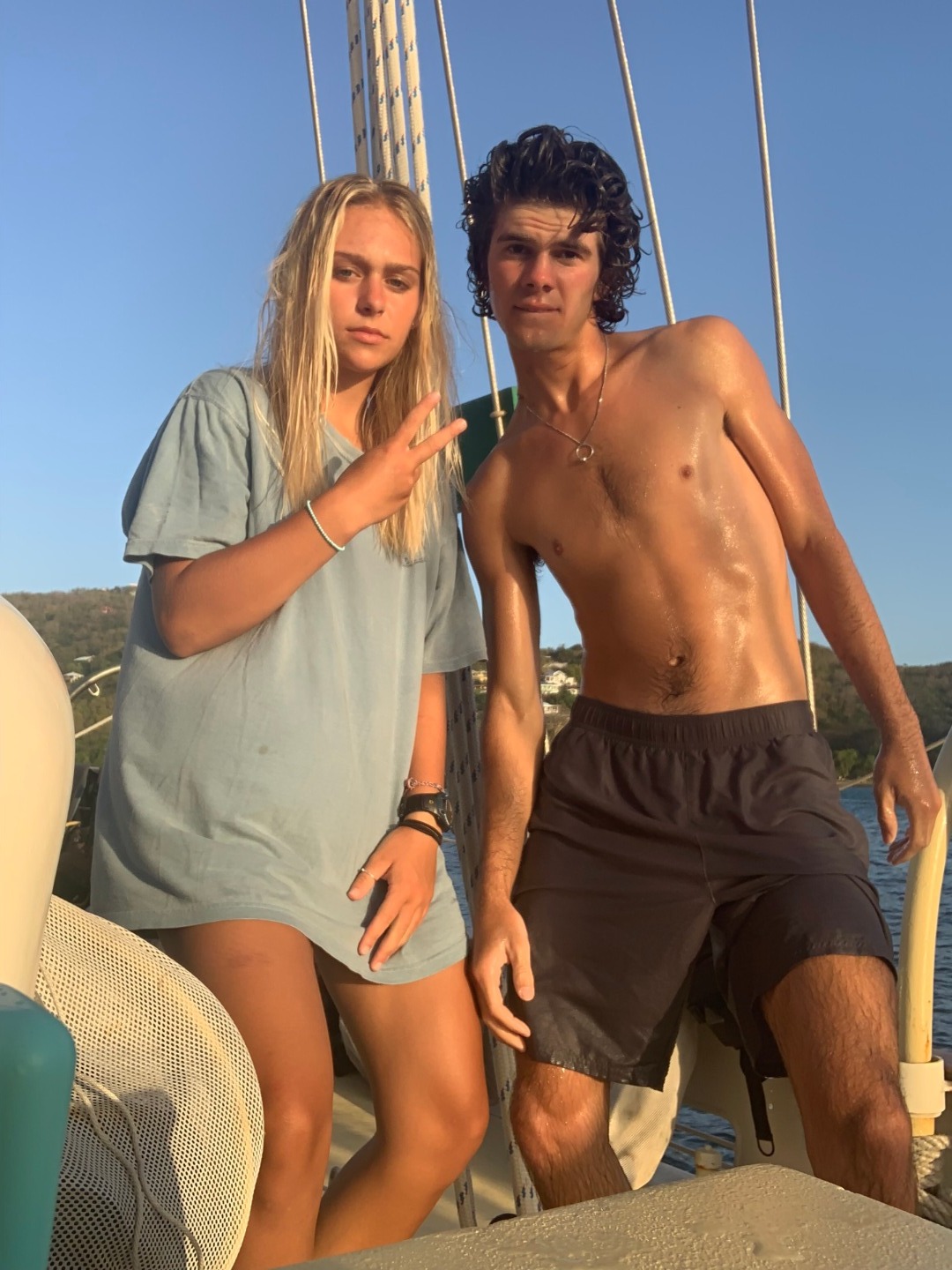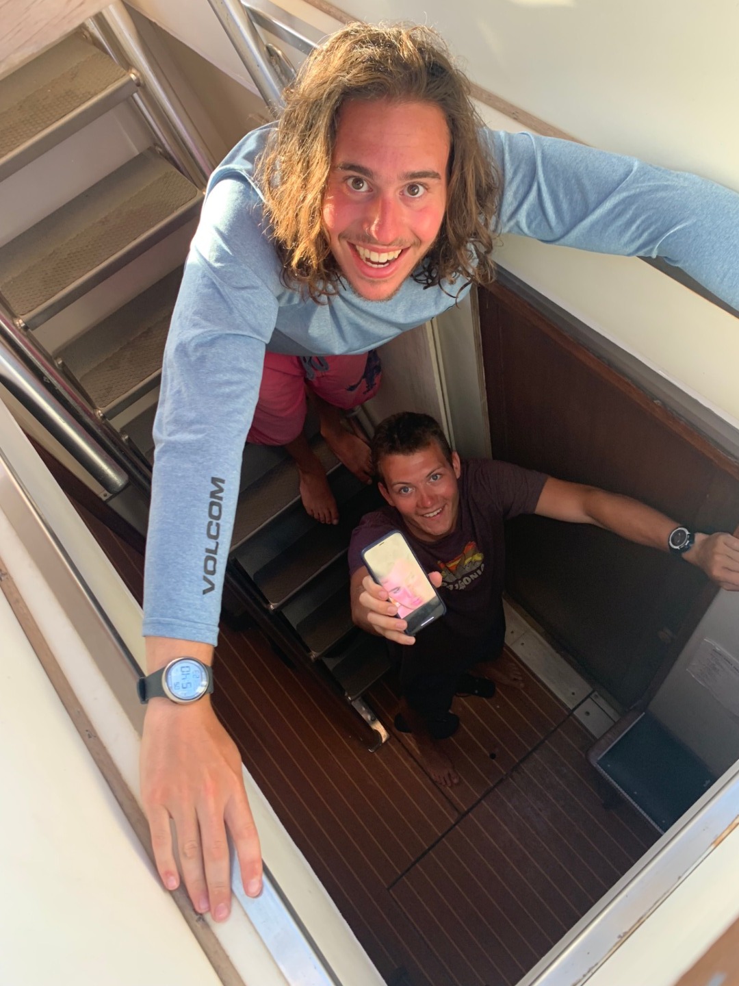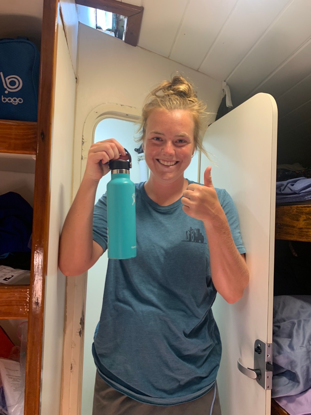 Pictured: Kasey, Matt B., and Gus being cool kids; Dory staying hydrated; Tye and Matt B. demonstrating being excited in the companionway; Hailey and Rob on deck; Faith smiling over the food she prepared; Hailey and Tye excited about the day.