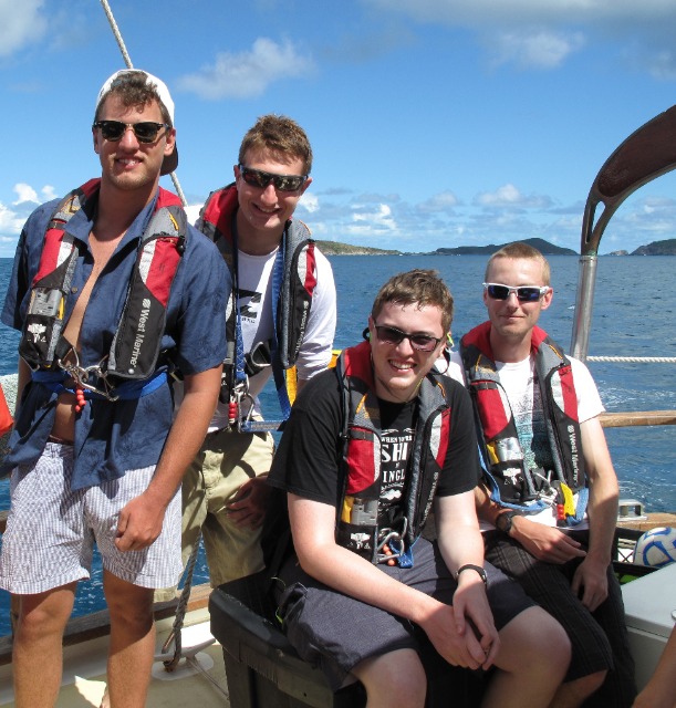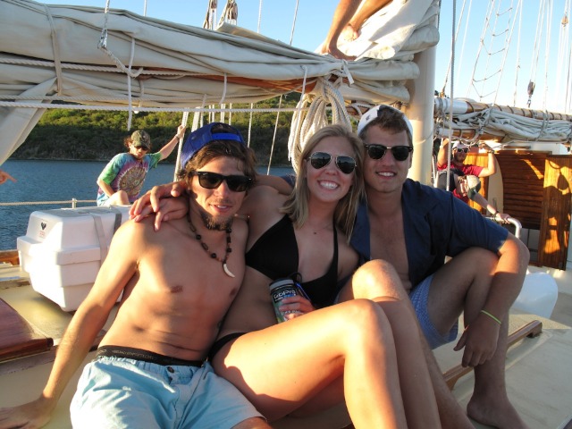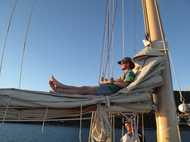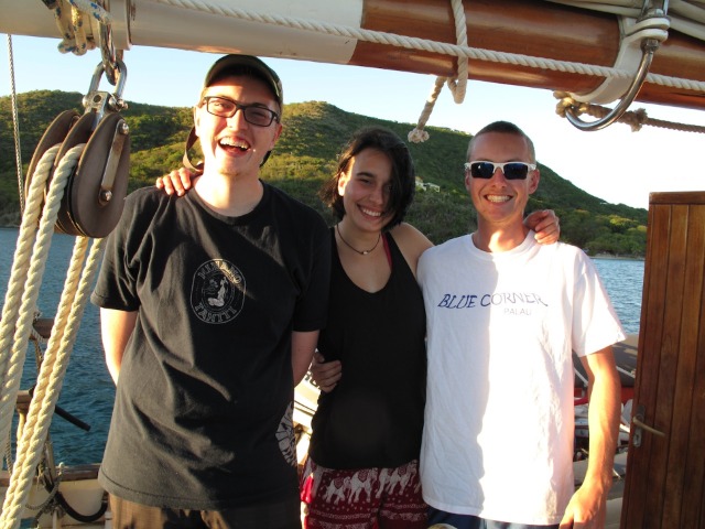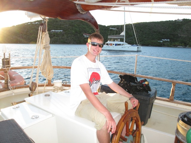 We hoisted our anchor up as the sun rose this morning and ate breakfast as we motored over to Great Dog for a morning dive. Just offshore of Great Dog lies an airplane wreck that has been a gathering place for marine creatures for over 20 years. The certified divers entered the water first and were treated to the sight of large barracudas hovering around the wreck. Our open water divers descended, practiced diving skills in the sand, and then explored the airplane themselves. After exiting the water, we immediately pulled up our anchor or hook and headed for Trellis Bay on the island of Tortola. The shipmates enjoyed some time onshore to see the island and eat some fresh fruit in the blue Caribbean waters. Carolyn, Drew, and Reilly went to the capital, Road Town, to provide food for our next ten days at sea – it took two full dinghies to carry all our food to the boat. Once the food was put away and the boat prepared for passage, we gathered in the cockpit for a dinner of Eggplant Parmesan. After the dishes are done, we will pick up our anchor for the third time today to set sail for our first overnight passage. I can’t wait to sail underneath the stars and above the bioluminescent waters tonight, and tomorrow, we’ll wake to nothing but blue waters (and hopefully blue skies!)