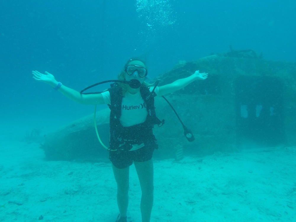 This morning, we woke up in Gorda Sound with a view of Saba Rock and Bitter End Yacht Club. We promptly picked up anchor and motored out of the channel to the Dog Islands, where we would be wreck diving at Coral Gardens, which happens to be a garden of coral. This was my first wreck dive and was the third specialty dive out of five required for our advanced open water certification. The wreck was amazing! It was an old airline jet that crashed in the ocean in the ’60s, and there were fish and corals inhabiting both the interior and exterior of the plane. We looked inside the windows of the jet and then explored more of the corals, where we saw a giant lobster, a stingray, and a sea turtle.