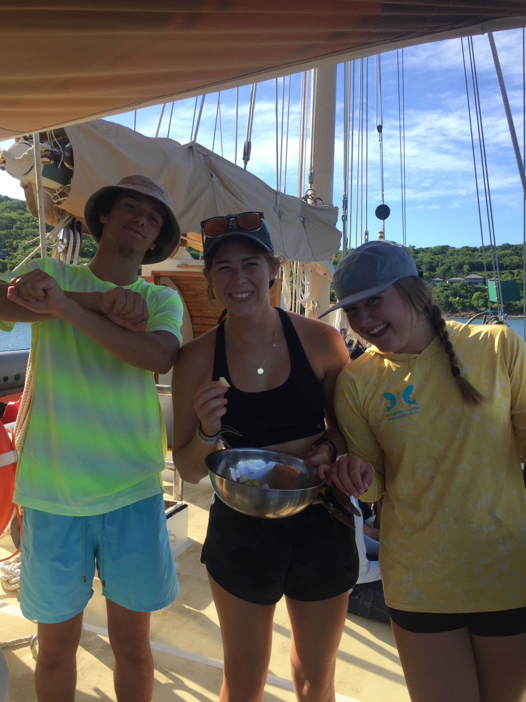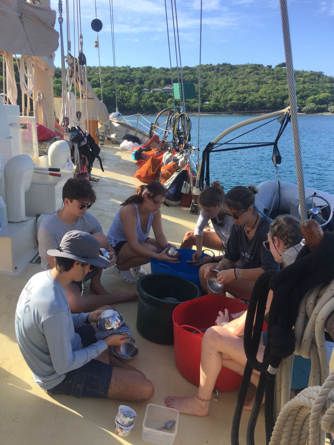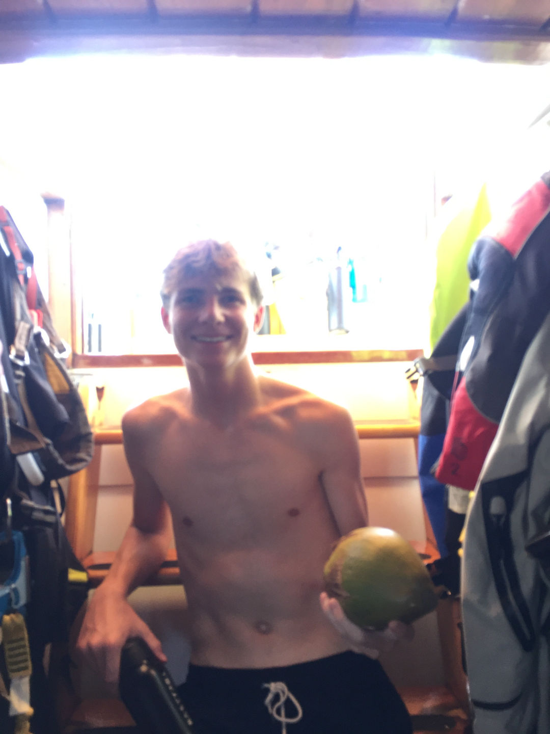We started the day off by getting woken up by the lovely bilge alarm, but not to worry, all is well. Those who were already awake got a good laugh at everyone coming from their bunks with their pajamas and life jackets. After breakfast, we took the dinghy to the beach to play a game of capture the flag for group bonding (my team won, of course). Our game became very competitive and consisted of some pretty hilarious wipeouts. After we were done with that, we convinced Lucas to climb the nearby palm tree so we could try to crack open a coconut. We swam back to the boat and got to see some cool fish, along with a huge jellyfish, on the way back. Once back on board, Meg and Heather started to teach us how to break down and put together our dive equipment. We ate lunch and then got our groups together to start our intro to scuba. Everyone was pretty pumped for our first dive lesson. We went back to the beach to learn more of the ins and outs of diving and finally got to use our equipment. We were all pretty hungry and ready for dinner by the time we were done. Once dinner was ready and we were all settled down to eat, a downpour came out of nowhere and sent us all running below deck and trying to save all our food. Im having so much fun, and everything here is so cool. Once Im done with the blog, Im going to end the day by hanging out with everyone and finally learning how to play poker.