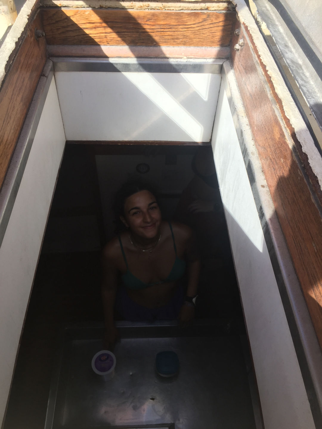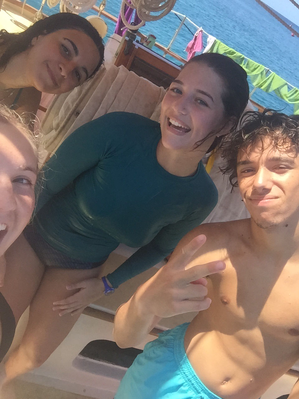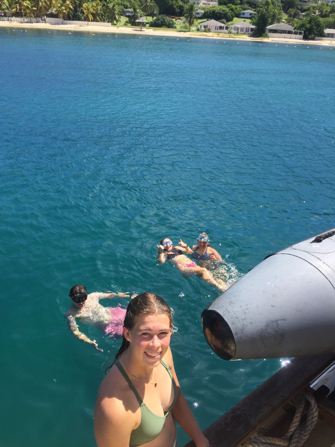 We started the day off by getting woken up by the lovely bilge alarm, but not to worry, all is well. Those who were already awake got a good laugh at everyone coming from their bunks with their pajamas and life jackets. After breakfast, we took the dinghy to the beach to play a game of capture the flag for group bonding (my team won, of course). Our game became very competitive and consisted of some pretty hilarious wipeouts. After we were done with that, we convinced Lucas to climb the nearby palm tree so we could try to crack open a coconut. We swam back to the boat and got to see some cool fish, along with a huge jellyfish, on the way back. Once back on board, Meg and Heather started to teach us how to break down and put together our dive equipment. We ate lunch and then got our groups together to start our intro to scuba. Everyone was pretty pumped for our first dive lesson. We went back to the beach to learn more of the ins and outs of diving and finally got to use our equipment. We were all pretty hungry and ready for dinner by the time we were done. Once dinner was ready and we were all settled down to eat, a downpour came out of nowhere and sent us all running below deck and trying to save all our food. Im having so much fun, and everything here is so cool. Once Im done with the blog, Im going to end the day by hanging out with everyone and finally learning how to play poker.
