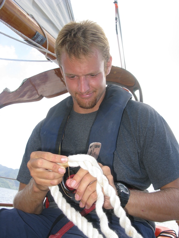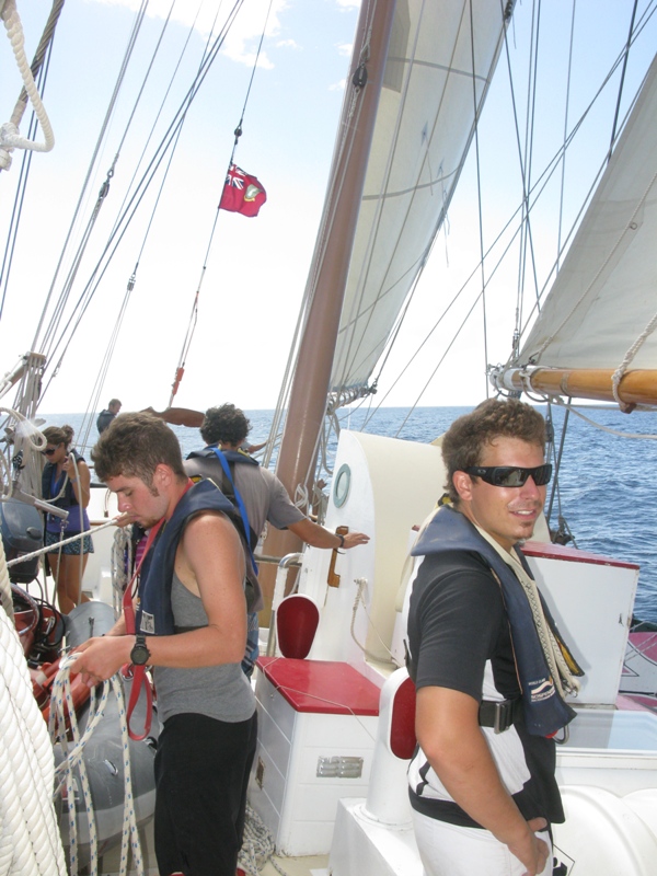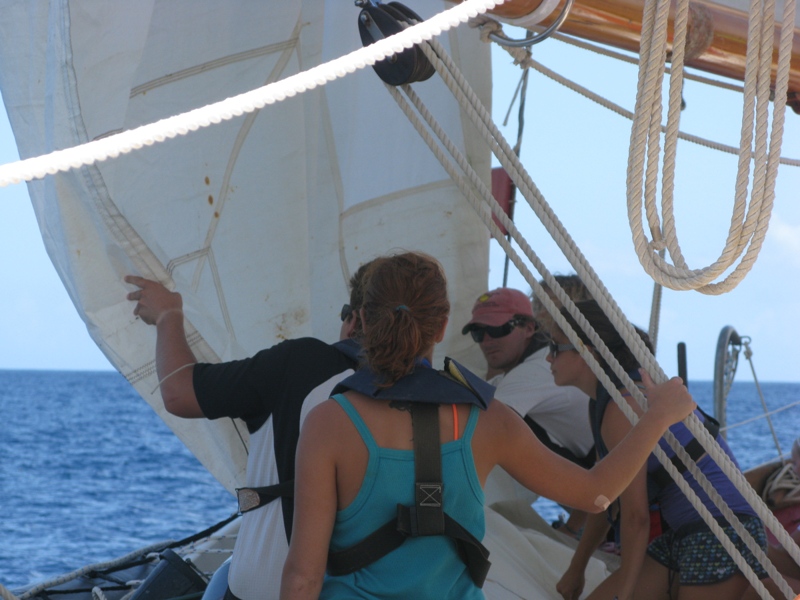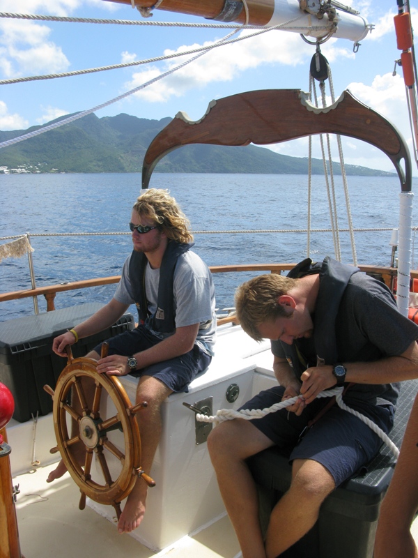 A day on the high seas unlike any other, for on this day, we sail with a new purpose-tacking and jibing! After leaving port with a bit of undirected vigor for which I am responsible, we set out to play in the sea. Sailors were put in three positions to control- Jib and Staysail, Foresail, and Main sheets- all shone with enthusiasm. As we came close to Guadeloupe, the anchor was swallowed by the depths, and all hands prepared to dive. The site for said diving mission was Jacques Cousteau Marine Park. All dove well and sated their appetite for the sea. Good even, and may morrow bring scouring light to the creatures that plague the helm.